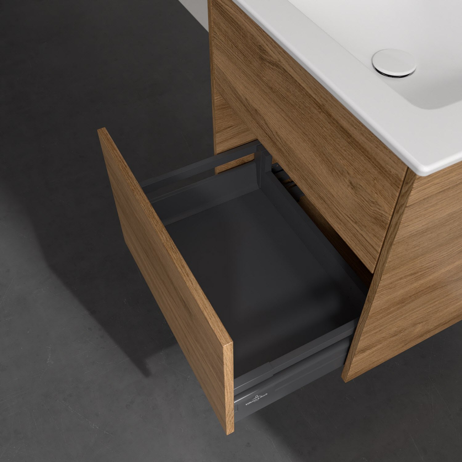 Stilsicher fügt sich der Finero Waschtischunterschrank von Villeroy & Boch mit seinem modernen, klaren Design in jedes Badezimmer ein. Seine beiden Auszüge verfügen über viel Platz für beispielsweise Handtücher, Föhn oder Pflegeprodukte aller Art. Durch die unterschiedliche Höhe eignet sich der obere Auszug besonders für kleinere, handlichere Gegenstände und im unteren können auch sperrigere Accessoires verstaut werden. Integriertem Antirutsch-Boden sei dank, bleiben diese auch am gewünschten Platz. Öffnen lassen sich die Auszüge bequem mit der innovativen Push-to-Open-Technologie – ein leichter Fingerdruck reicht aus . Geschmeidig sanft und leise gleiten sie anschließend über Selbsteinzug wieder zu.