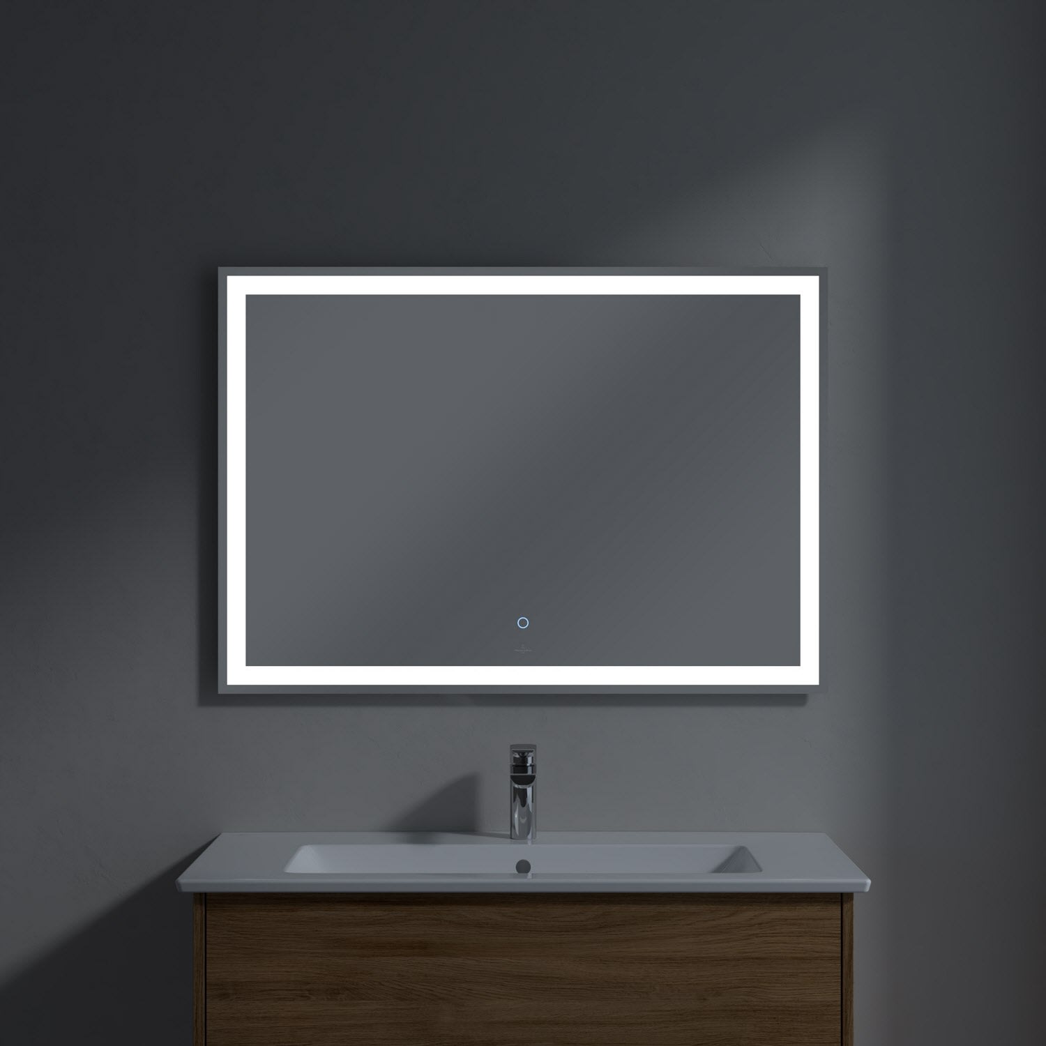 Der rechteckige Finero Lichtspiegel komplettiert das Möbel-Set und bringt den Waschplatz regelrecht zum Strahlen. Das stimmig integrierte, komplett umlaufende LED-Lichtband setzt den Spiegel optisch von der Wand ab und sorgt für eine ideale Ausleuchtung in Tageslichtweiß beim Schminken oder Frisieren. Bedient wird das Licht über den mittig platzierten Touch-Sensor auf der Spiegelfläche oder über Raumschaltung. Besonders praktisch: der Sensor leuchtet auch bei ausgeschaltetem Licht zum leichteren Finden auch bei Dunkelheit.
