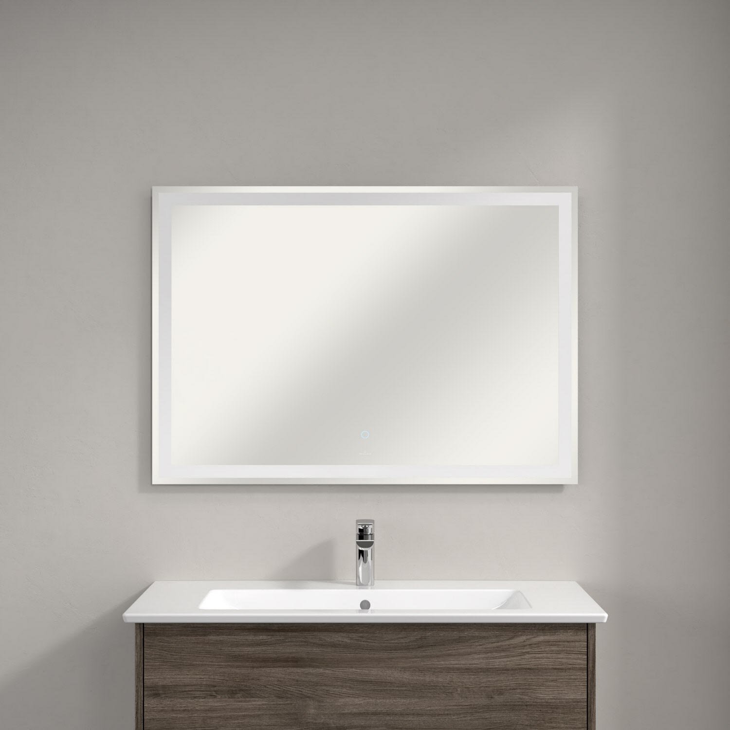 Der rechteckige Finero Lichtspiegel komplettiert das Möbel-Set und bringt den Waschplatz regelrecht zum Strahlen. Das stimmig integrierte, komplett umlaufende LED-Lichtband setzt den Spiegel optisch von der Wand ab und sorgt für eine ideale Ausleuchtung in Tageslichtweiß beim Schminken oder Frisieren. Bedient wird das Licht über den mittig platzierten Touch-Sensor auf der Spiegelfläche oder über Raumschaltung. Besonders praktisch: der Sensor leuchtet auch bei ausgeschaltetem Licht zum leichteren Finden auch bei Dunkelheit.