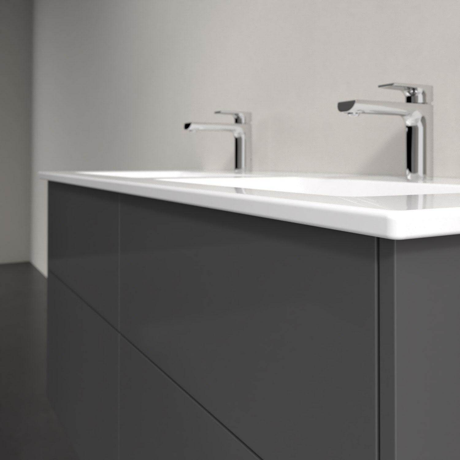 Der rechteckige Finero Waschtisch präsentiert sich besonders filigran und leicht mit seinen dünnen Kanten. Die beiden großzügig gestalteten Becken können praktischerweise zeitgleich von zwei Personen genutzt werden und erweisen sich dank ihrer Tiefe als besonders komfortabel bei der täglichen Badroutine. Rundherum befinden sich geräumige seitliche Ablageflächen und eine breite Hahnlochbank für die wichtigsten Badaccessoires wie Seife oder Zahnputzbecher. Die hochwertige Sanitärkeramik von Villeroy & Boch ist besonders robust und pflegeleicht . Dank der schmutzabweisenden Oberfläche geht die Reinigung schnell und einfach von der Hand.