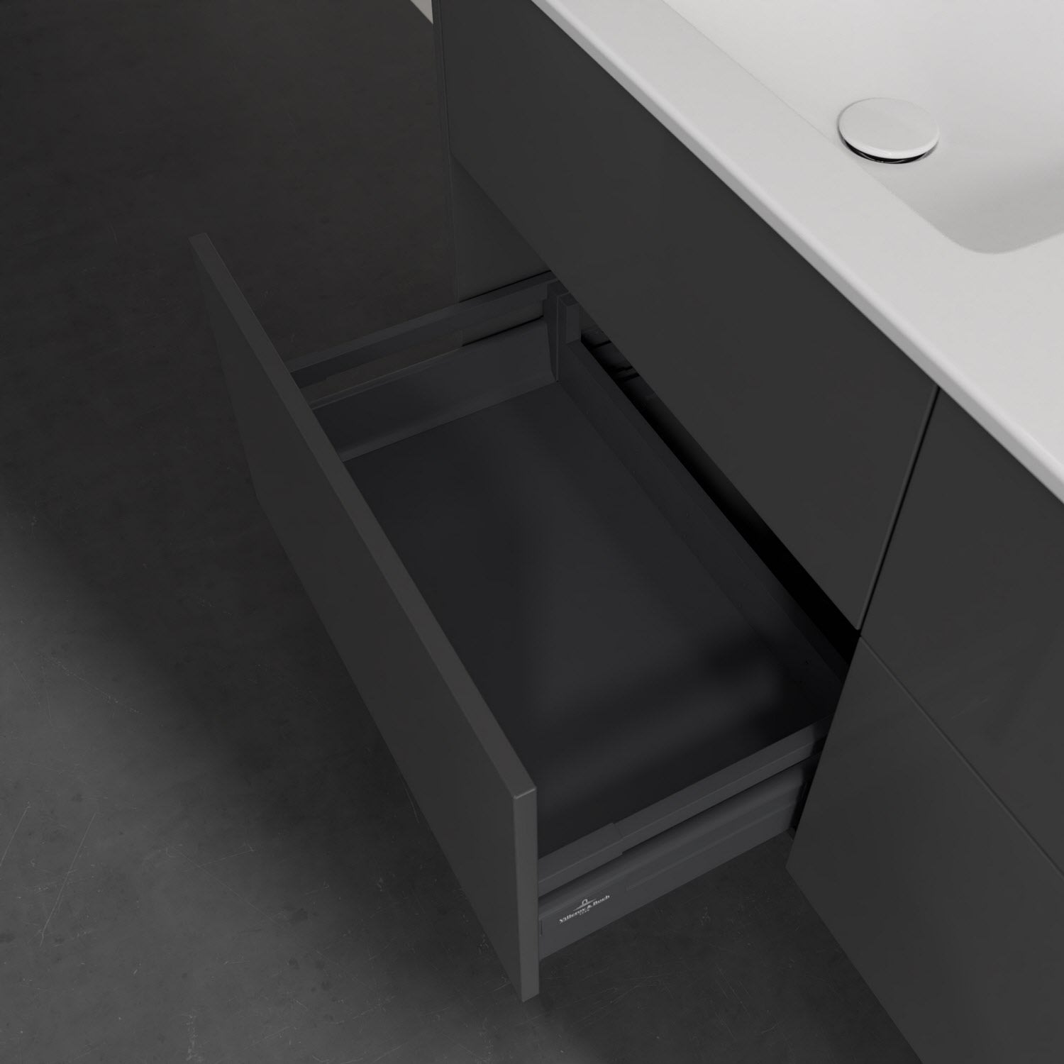 Stilsicher fügt sich der Finero Waschtischunterschrank von Villeroy & Boch mit seinem modernen, klaren Design in jedes Badezimmer ein. Seine vier Auszüge verfügen über viel Platz für beispielsweise Handtücher, Föhn oder Pflegeprodukte aller Art. Durch die unterschiedliche Höhe eignet sich der obere Auszug besonders für kleinere, handlichere Gegenstände und im unteren können auch sperrigere Accessoires verstaut werden. Integriertem Antirutsch-Boden sei dank, bleiben diese auch am gewünschten Platz. Öffnen lassen sich die Auszüge bequem mit der innovativen Push-to-Open-Technologie – ein leichter Fingerdruck reicht aus . Geschmeidig sanft und leise gleiten sie anschließend über Selbsteinzug wieder zu.