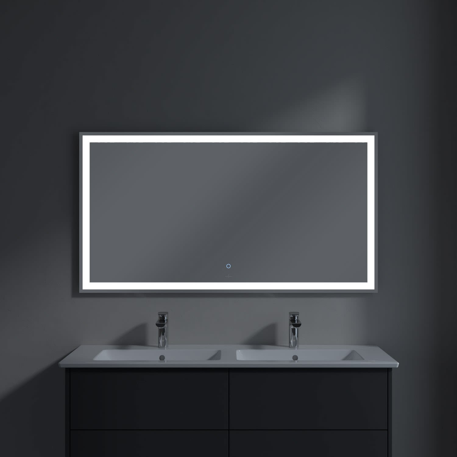 Der rechteckige Finero Lichtspiegel komplettiert das Möbel-Set und bringt den Waschplatz regelrecht zum Strahlen. Das stimmig integrierte, komplett umlaufende LED-Lichtband setzt den Spiegel optisch von der Wand ab und sorgt für eine ideale Ausleuchtung in Tageslichtweiß beim Schminken oder Frisieren. Bedient wird das Licht über den mittig platzierten Touch-Sensor auf der Spiegelfläche oder über Raumschaltung. Besonders praktisch: der Sensor leuchtet auch bei ausgeschaltetem Licht zum leichteren Finden auch bei Dunkelheit.