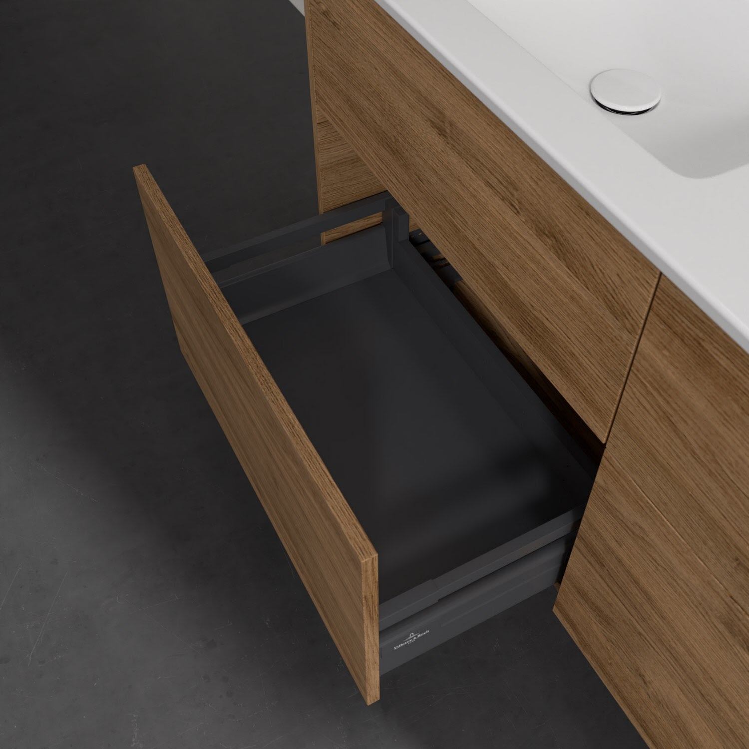 Stilsicher fügt sich der Finero Waschtischunterschrank von Villeroy & Boch mit seinem modernen, klaren Design in jedes Badezimmer ein. Seine vier Auszüge verfügen über viel Platz für beispielsweise Handtücher, Föhn oder Pflegeprodukte aller Art. Durch die unterschiedliche Höhe eignet sich der obere Auszug besonders für kleinere, handlichere Gegenstände und im unteren können auch sperrigere Accessoires verstaut werden. Integriertem Antirutsch-Boden sei dank, bleiben diese auch am gewünschten Platz. Öffnen lassen sich die Auszüge bequem mit der innovativen Push-to-Open-Technologie – ein leichter Fingerdruck reicht aus . Geschmeidig sanft und leise gleiten sie anschließend über Selbsteinzug wieder zu.