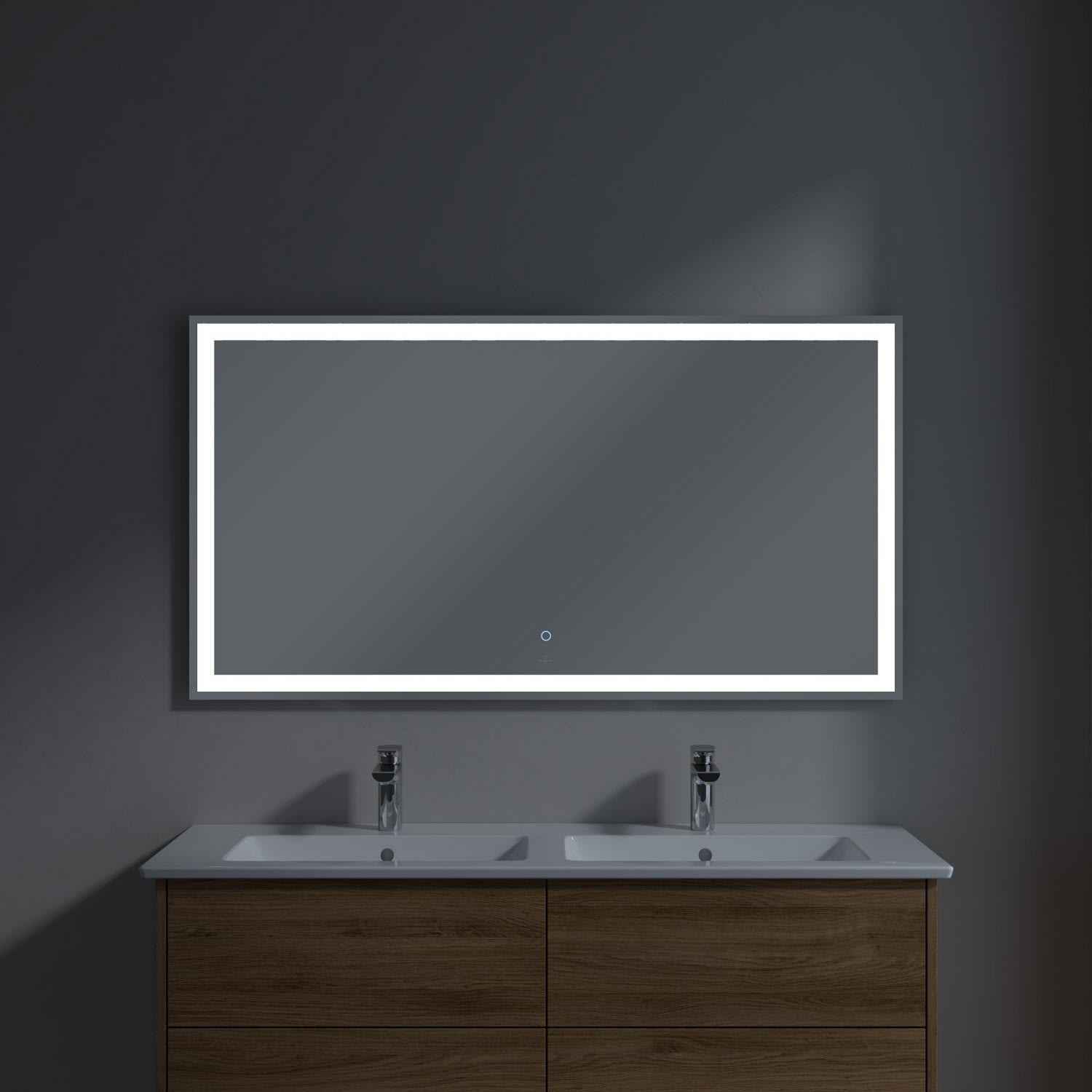 Der rechteckige Finero Lichtspiegel komplettiert das Möbel-Set und bringt den Waschplatz regelrecht zum Strahlen. Das stimmig integrierte, komplett umlaufende LED-Lichtband setzt den Spiegel optisch von der Wand ab und sorgt für eine ideale Ausleuchtung in Tageslichtweiß beim Schminken oder Frisieren. Bedient wird das Licht über den mittig platzierten Touch-Sensor auf der Spiegelfläche oder über Raumschaltung. Besonders praktisch: der Sensor leuchtet auch bei ausgeschaltetem Licht zum leichteren Finden auch bei Dunkelheit.