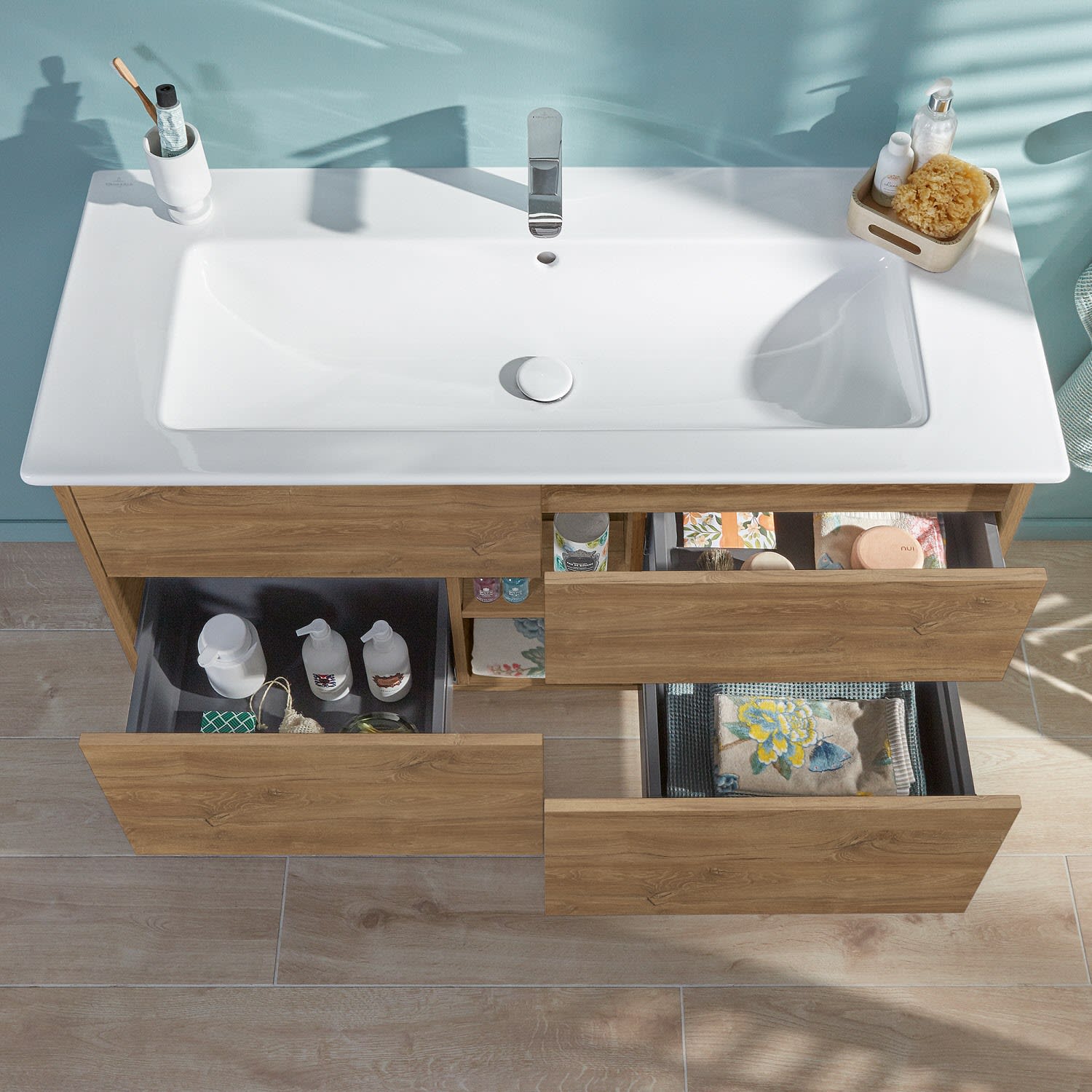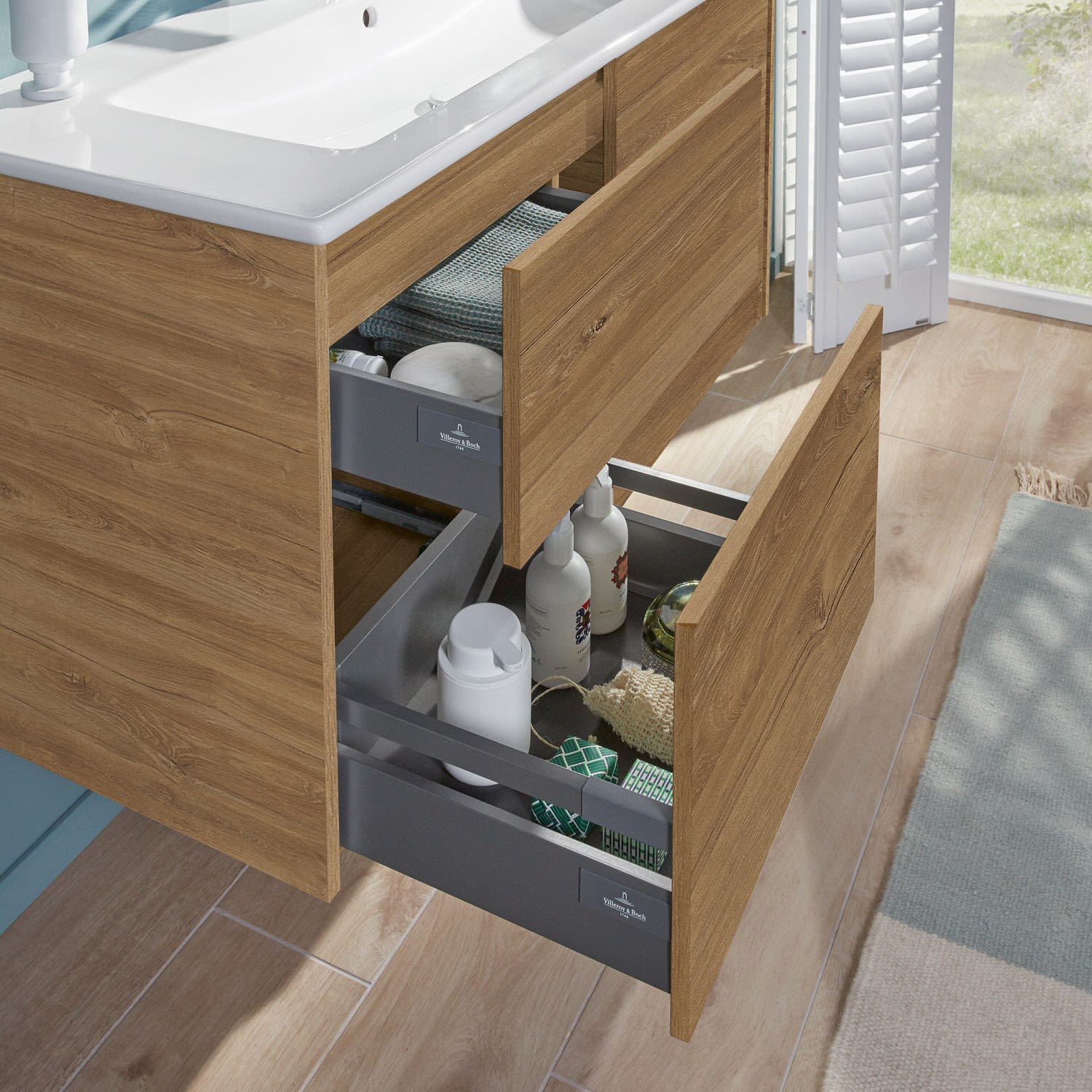 Stilsicher fügt sich der Finero Waschtischunterschrank von Villeroy & Boch mit seinem modernen, klaren Design in jedes Badezimmer ein. Seine vier Auszüge verfügen über viel Platz für beispielsweise Handtücher, Föhn oder Pflegeprodukte aller Art. Durch die unterschiedliche Höhe eignet sich der obere Auszug besonders für kleinere, handlichere Gegenstände und im unteren können auch sperrigere Accessoires verstaut werden. Integriertem Antirutsch-Boden sei dank, bleiben diese auch am gewünschten Platz. Öffnen lassen sich die Auszüge bequem mit der innovativen Push-to-Open-Technologie – ein leichter Fingerdruck reicht aus . Geschmeidig sanft und leise gleiten sie anschließend über Selbsteinzug wieder zu.