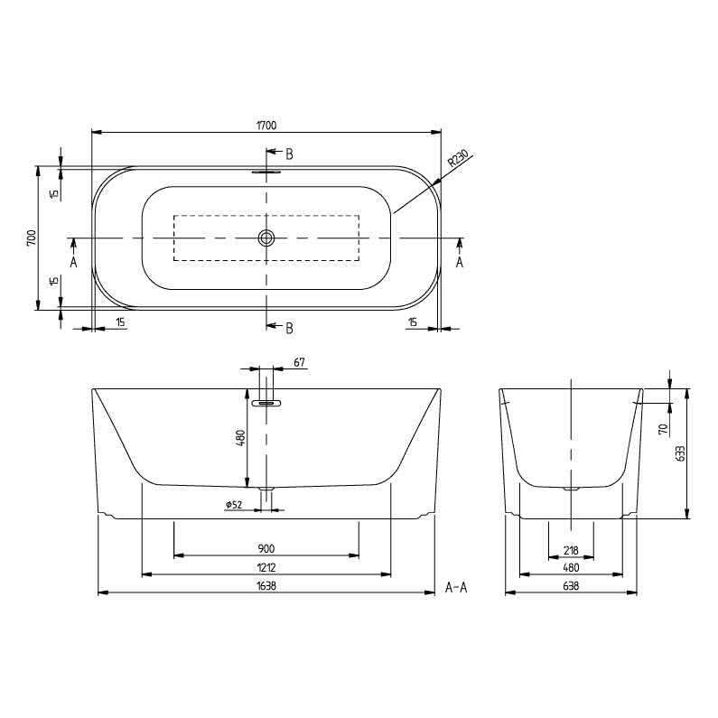 Villeroy & Boch Finion freistehende Badewanne, 170 x 70 cm mit Design-Ring