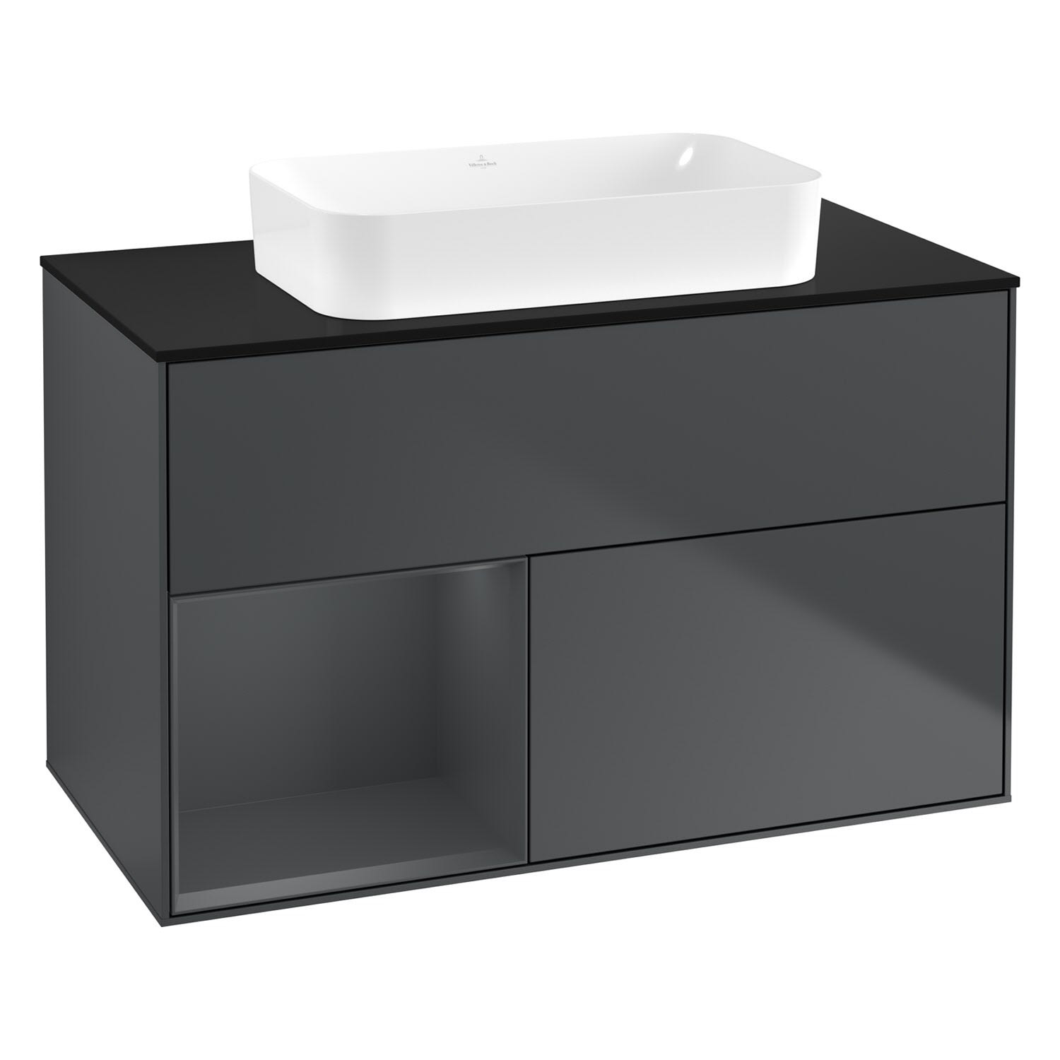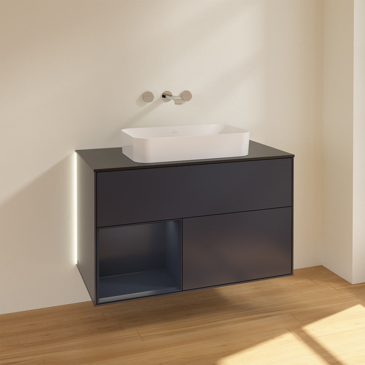 Villeroy & Boch Finion Waschtischunterschrank 100 cm mit Regalelement links und Abdeckplatte, mit Wandbeleuchtung