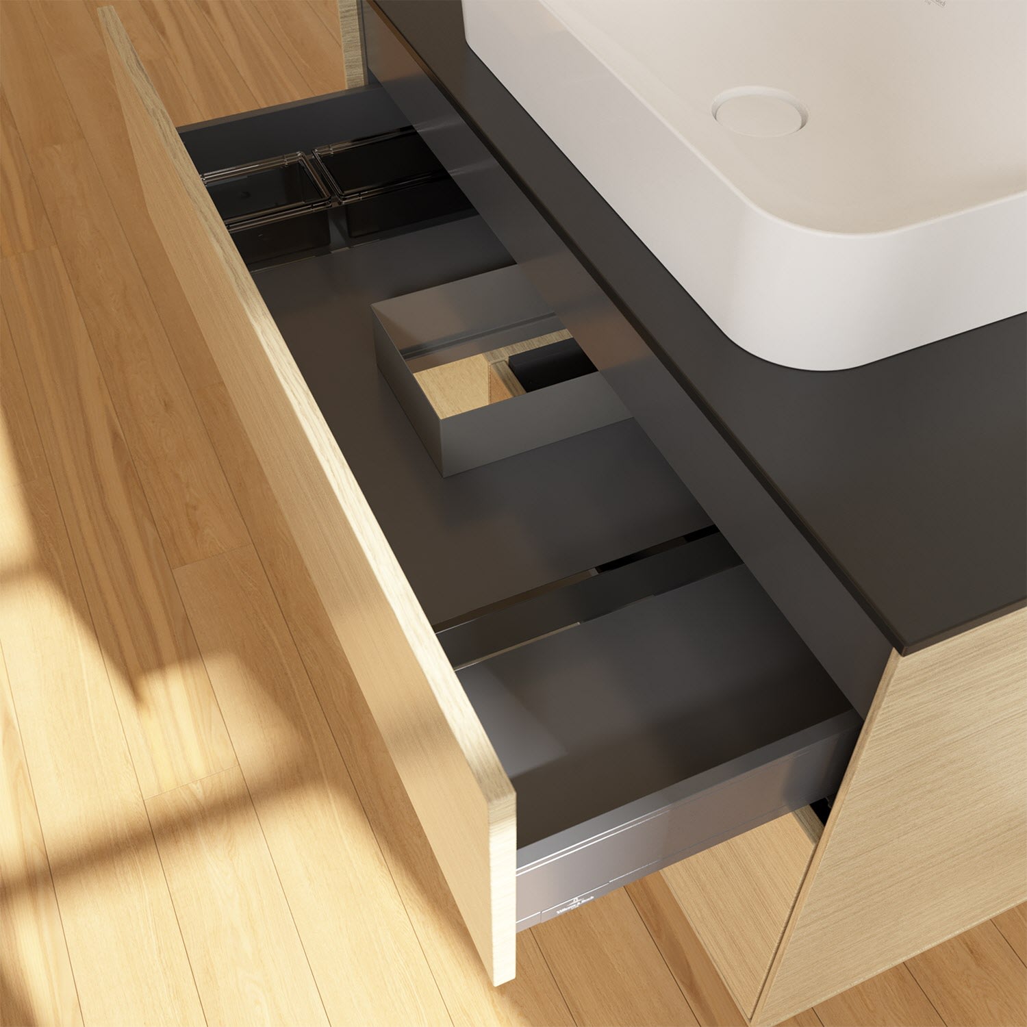 - kein Umfallen oder Verrutschen von Pflegeprodukten in den Schubladen dank rutschhemmendem Boden