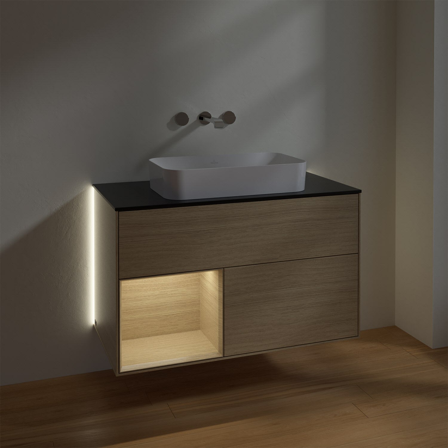 Villeroy & Boch Finion Waschtischunterschrank 100 cm mit Regalelement links und Abdeckplatte, mit Wandbeleuchtung