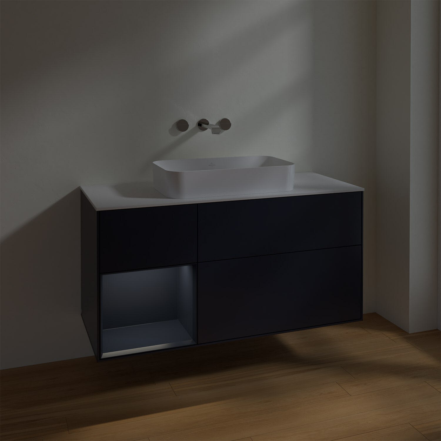 Der stilvolle Waschbeckenunterschrank der Kollektion Finion von Villeroy & Boch ist ein wahres Stauraumwunder. Gleich drei großzügige Auszüge mit grifflosen Fronten bieten ein individuelles Ordnungssystem mit praktischer Inneneinteilung dank versetzbaren Glasabtrennungen, Accessory Boxen für Badutensilien und rutschhemmenden Böden, bei denen alles am Platz bleibt. Öffnen lassen sich die Auszüge mit einem leichten Druck. Per Selbsteinzug ziehen sie sich langsam zu und werden dabei dank SoftClosing-Technik sanft gedämpft. Ein schickes Regalelement mit stimmungsvoller LED-Beleuchtung befindet sich neben dem unteren Auszug. Die seitliche Fläche neben dem Waschbecken bietet zusätzlich Stellfläche für Seife, Lotion & Co. Für eine hochwertige Beschaffenheit und Optik des Möbels sorgt die mehrschichtig lackierte Oberfläche.
