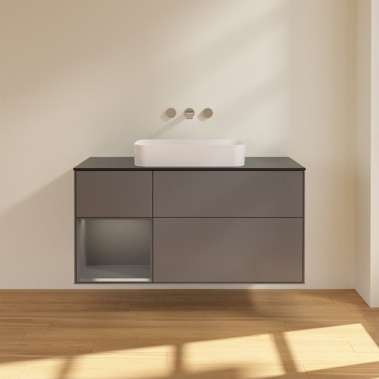 Der stilvolle Waschbeckenunterschrank der Kollektion Finion von Villeroy & Boch ist ein wahres Stauraumwunder. Gleich drei großzügige Auszüge mit grifflosen Fronten bieten ein individuelles Ordnungssystem mit praktischer Inneneinteilung dank versetzbaren Glasabtrennungen, Accessory Boxen für Badutensilien und rutschhemmenden Böden, bei denen alles am Platz bleibt. Öffnen lassen sich die Auszüge mit einem leichten Druck. Per Selbsteinzug ziehen sie sich langsam zu und werden dabei dank SoftClosing-Technik sanft gedämpft. Ein schickes Regalelement mit stimmungsvoller LED-Beleuchtung befindet sich neben dem unteren Auszug. Die seitliche Fläche neben dem Waschbecken bietet zusätzlich Stellfläche für Seife, Lotion & Co. Für eine hochwertige Beschaffenheit und Optik des Möbels sorgt die mehrschichtig lackierte Oberfläche.