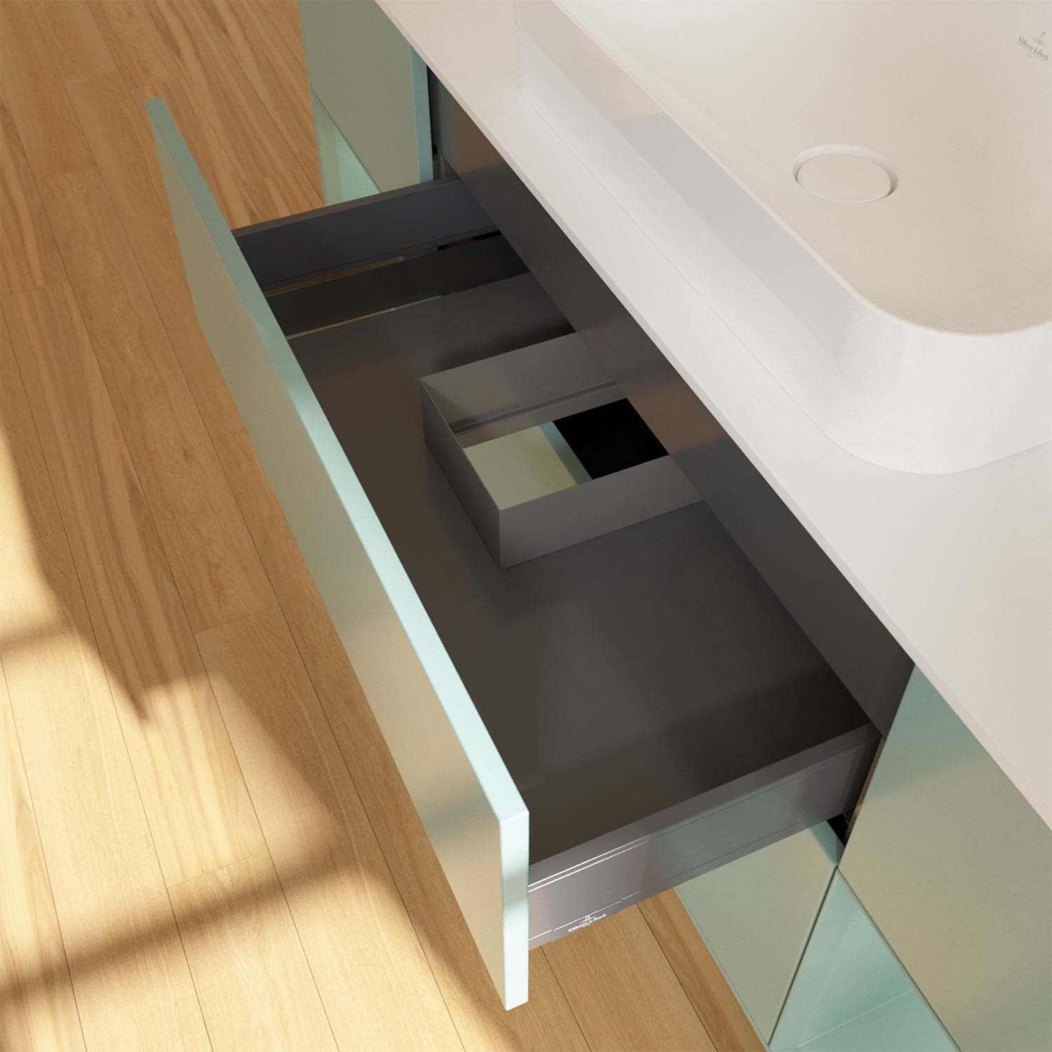 Der stilvolle Waschbeckenunterschrank der Kollektion Finion von Villeroy & Boch ist ein wahres Stauraumwunder. Gleich vier großzügige Auszüge mit grifflosen Fronten bieten ein individuelles Ordnungssystem mit praktischer Inneneinteilung dank versetzbaren Glasabtrennungen, Accessory Boxen für Badutensilien und rutschhemmenden Böden, bei denen alles am Platz bleibt. Öffnen lassen sich die Auszüge mit einem leichten Druck. Per Selbsteinzug ziehen sie sich langsam zu und werden dabei dank SoftClosing-Technik sanft gedämpft. Ergänzt wird der untere Auszug von zwei praktischen Regalelementen mit stimmungsvoller LED-Beleuchtung. Die seitlichen Flächen auf der Abdeckplatte bieten zusätzlich Stellfläche für Seife oder Zahnputzbecher. Für eine hochwertige Beschaffenheit und Optik des Möbels sorgt die mehrschichtig lackierte Oberfläche.