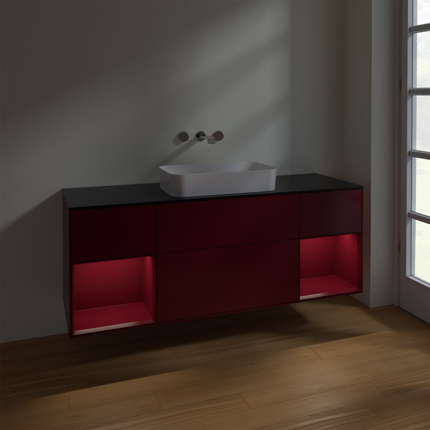 Der stilvolle Waschbeckenunterschrank der Kollektion Finion von Villeroy & Boch ist ein wahres Stauraumwunder. Gleich vier großzügige Auszüge mit grifflosen Fronten bieten ein individuelles Ordnungssystem mit praktischer Inneneinteilung dank versetzbaren Glasabtrennungen, Accessory Boxen für Badutensilien und rutschhemmenden Böden, bei denen alles am Platz bleibt. Öffnen lassen sich die Auszüge mit einem leichten Druck. Per Selbsteinzug ziehen sie sich langsam zu und werden dabei dank SoftClosing-Technik sanft gedämpft. Ergänzt wird der untere Auszug von zwei praktischen Regalelementen mit stimmungsvoller LED-Beleuchtung. Die seitlichen Flächen auf der Abdeckplatte bieten zusätzlich Stellfläche für Seife oder Zahnputzbecher. Für eine hochwertige Beschaffenheit und Optik des Möbels sorgt die mehrschichtig lackierte Oberfläche.