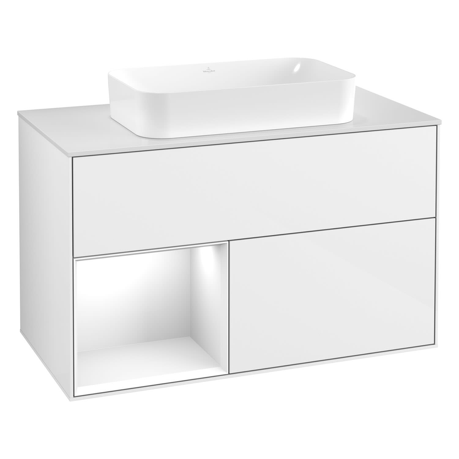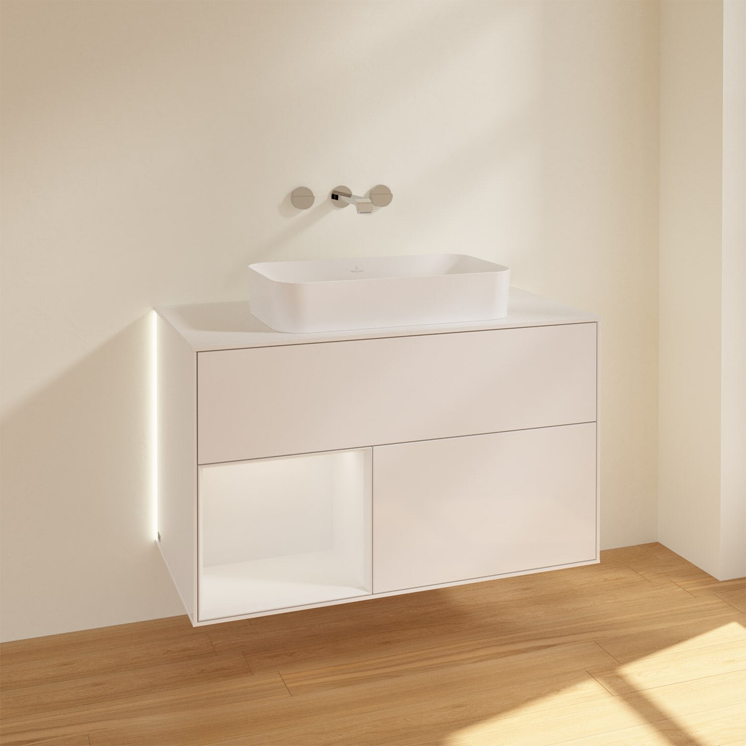 Villeroy & Boch Finion Waschtischunterschrank 100 cm mit Regalelement links und Abdeckplatte, mit Wandbeleuchtung
