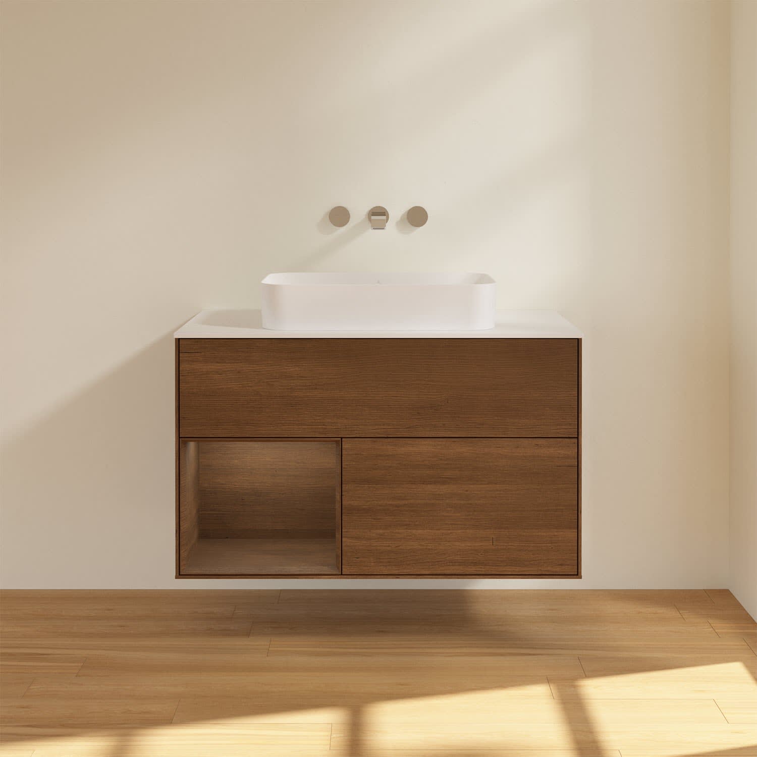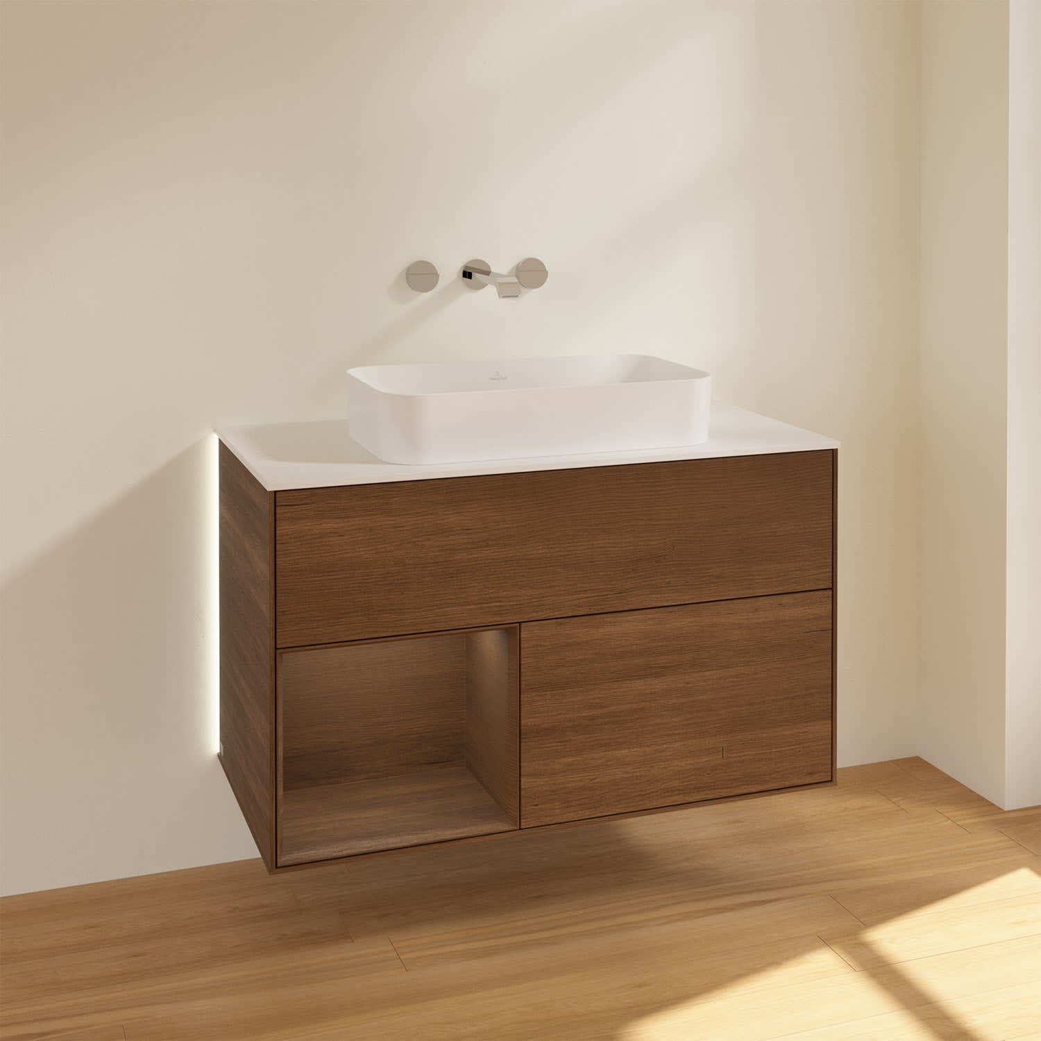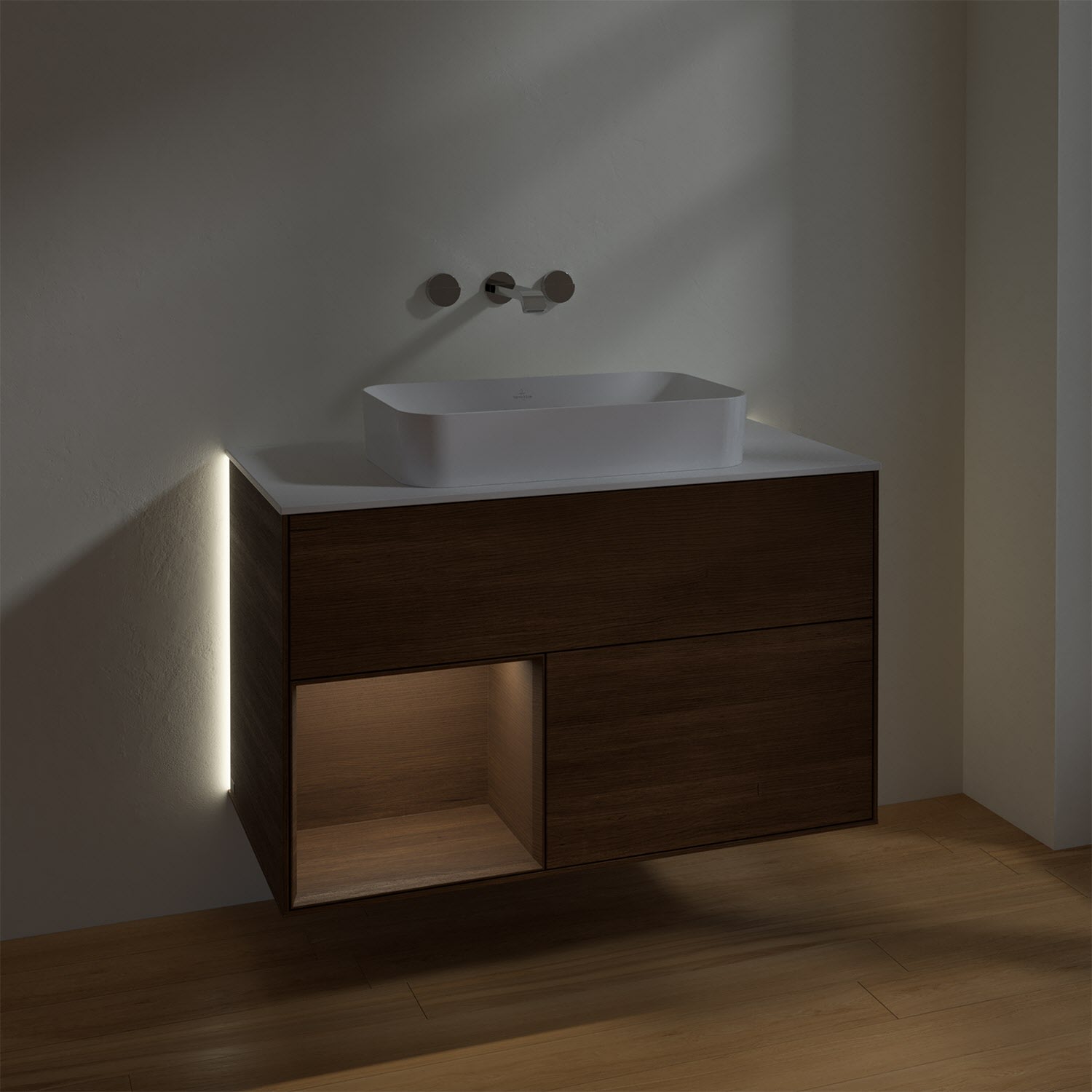 Villeroy & Boch Finion Waschtischunterschrank 100 cm mit Regalelement links und Abdeckplatte, mit Wandbeleuchtung