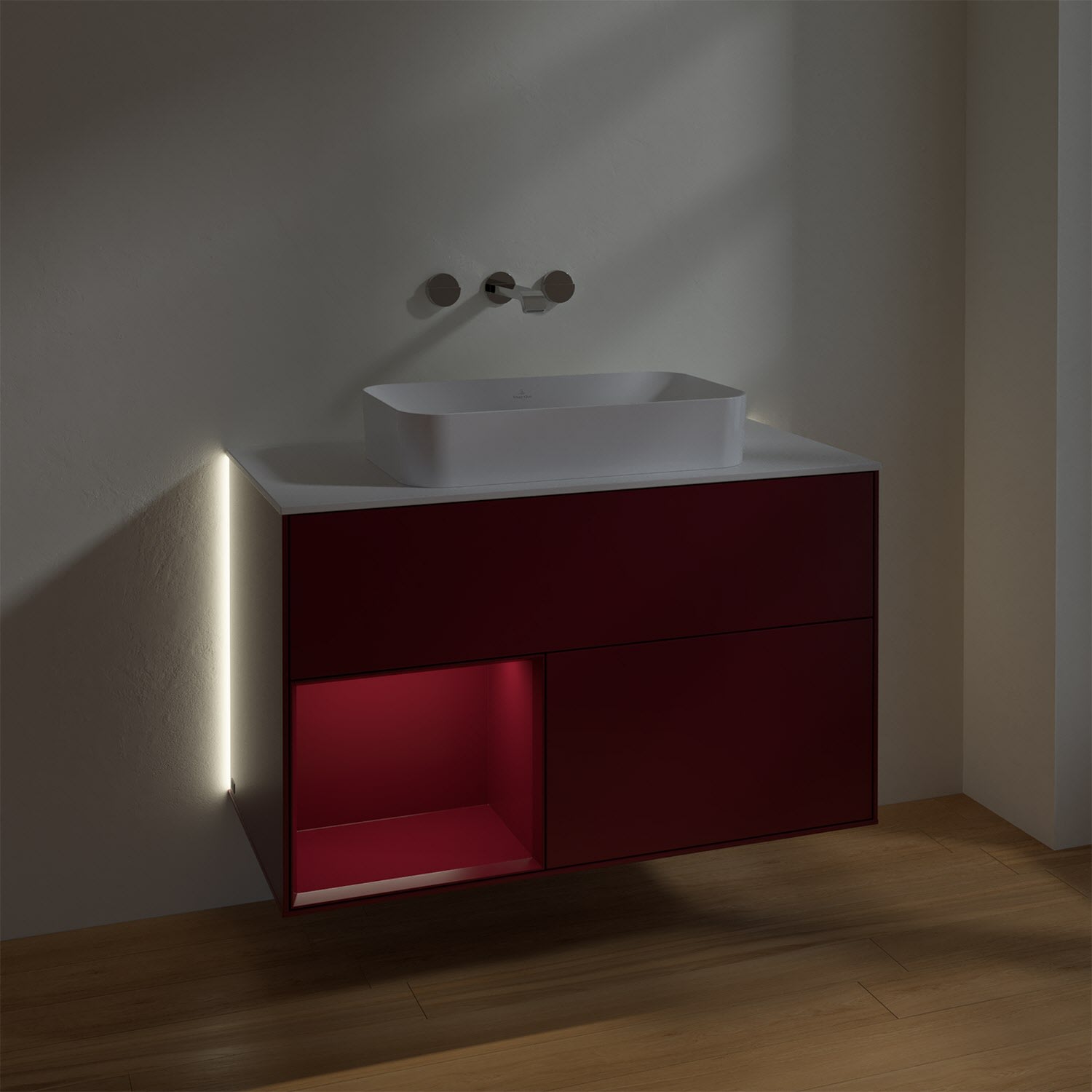 Villeroy & Boch Finion Waschtischunterschrank 100 cm mit Regalelement links und Abdeckplatte, mit Wandbeleuchtung