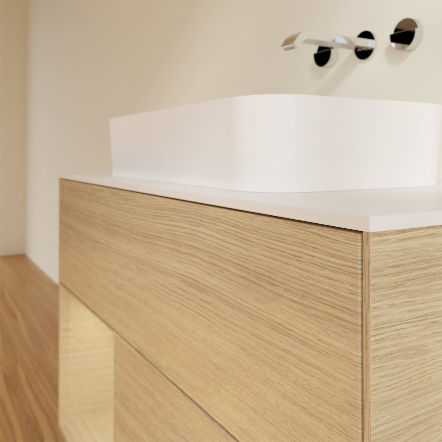 Ausdrucksstarkes Design und raffinierte Technik – der Finion Waschbeckenunterschrank von Villeroy & Boch punktet auf ganzer Linie. Er kombiniert großzügigen Stauraum mit wohnlicher Atmosphäre dank stimmungsvoller, dimmbarer LED-Wandbeleuchtung sowie einem beleuchteten Regalelement. Die beiden grifflosen Auszüge lassen sich dank Push-to-Open-Technik und Selbsteinzug ganz bequem öffnen und schließen. Im Inneren ermöglichen verstellbare Glasabtrennungen, Accessory Boxen für Badutensilien sowie rutschhemmende Böden ein individuelles Ordnungssystem und höchsten Komfort. Eine Ablagefläche für Seife, Zahnputzbecher und Co. bietet die Abdeckplatte. Für eine hochwertige Beschaffenheit und Optik des Möbels sorgt die mehrschichtig lackierte Oberfläche.