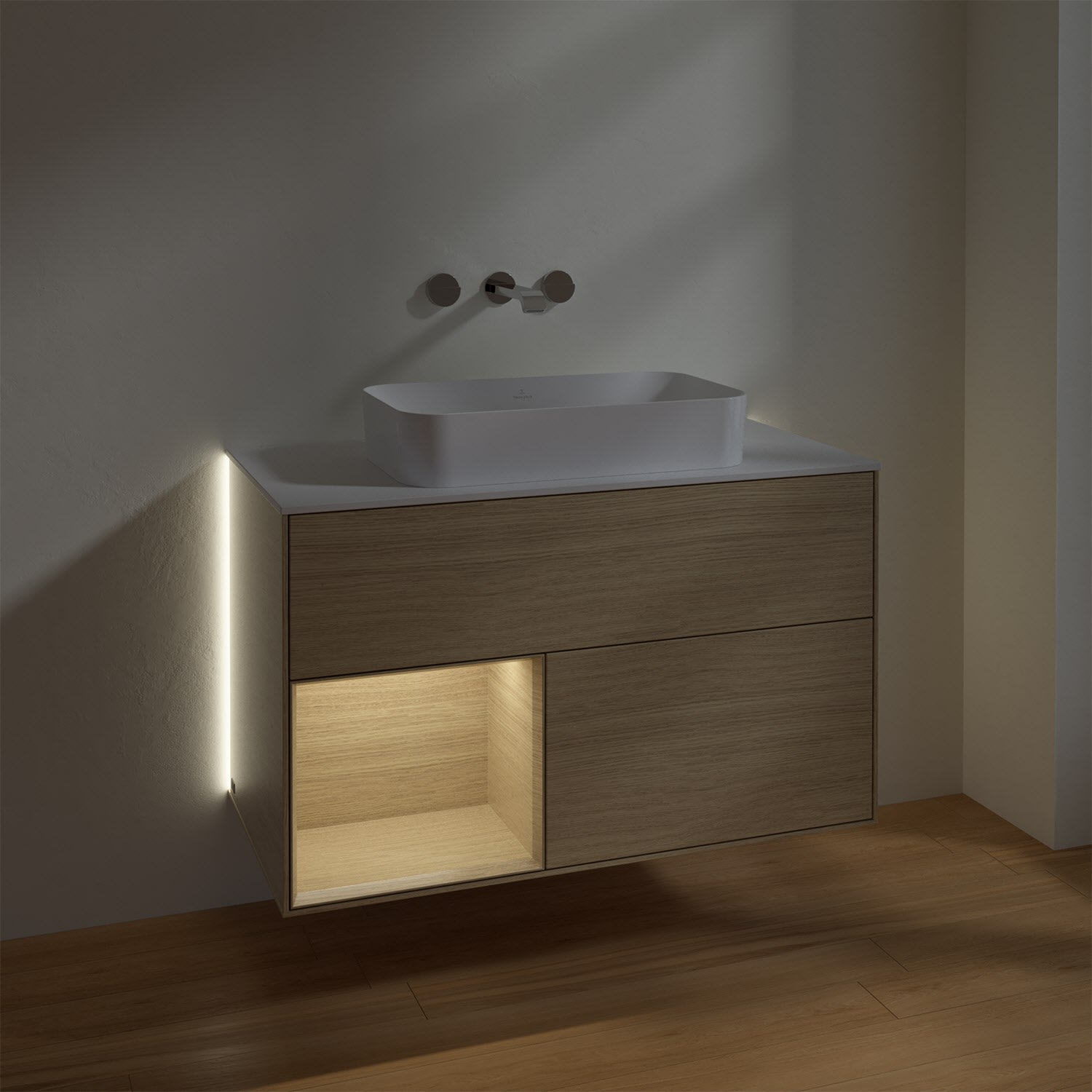Villeroy & Boch Finion Waschtischunterschrank 100 cm mit Regalelement links und Abdeckplatte, mit Wandbeleuchtung