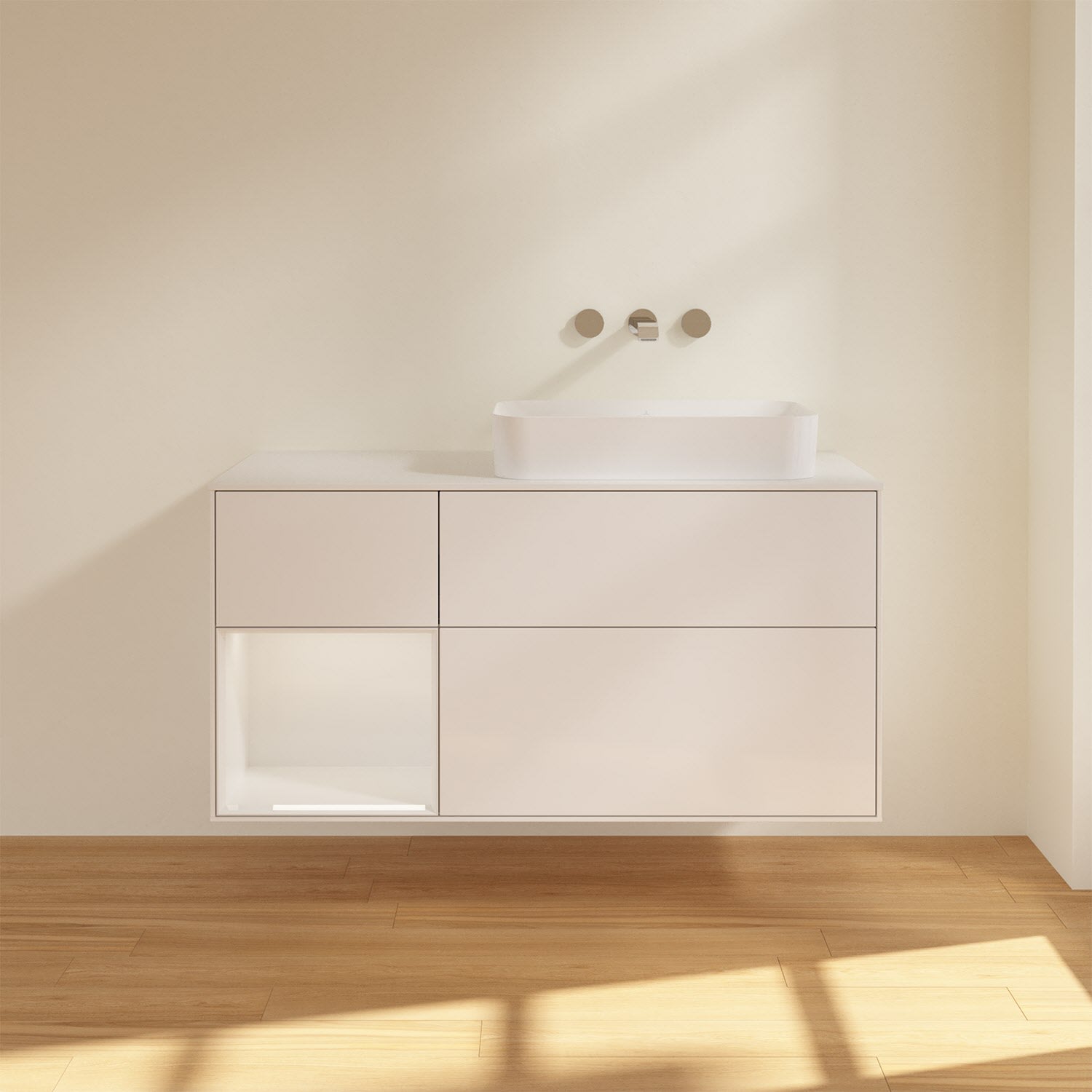Villeroy & Boch Finion Waschtischunterschrank 120 cm mit Regalelement links und Abdeckplatte, mit Wandbeleuchtung