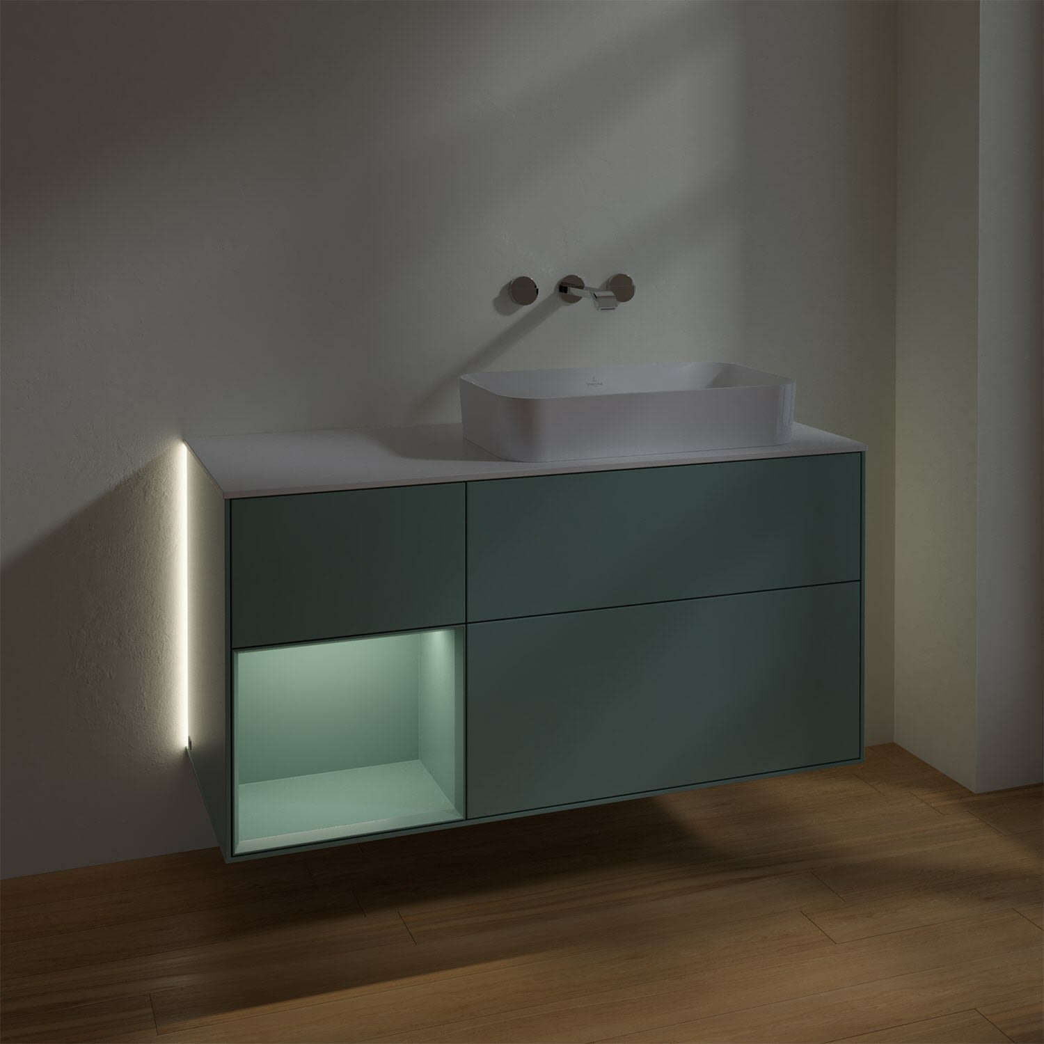 Villeroy & Boch Finion Waschtischunterschrank 120 cm mit Regalelement links und Abdeckplatte, mit Wandbeleuchtung