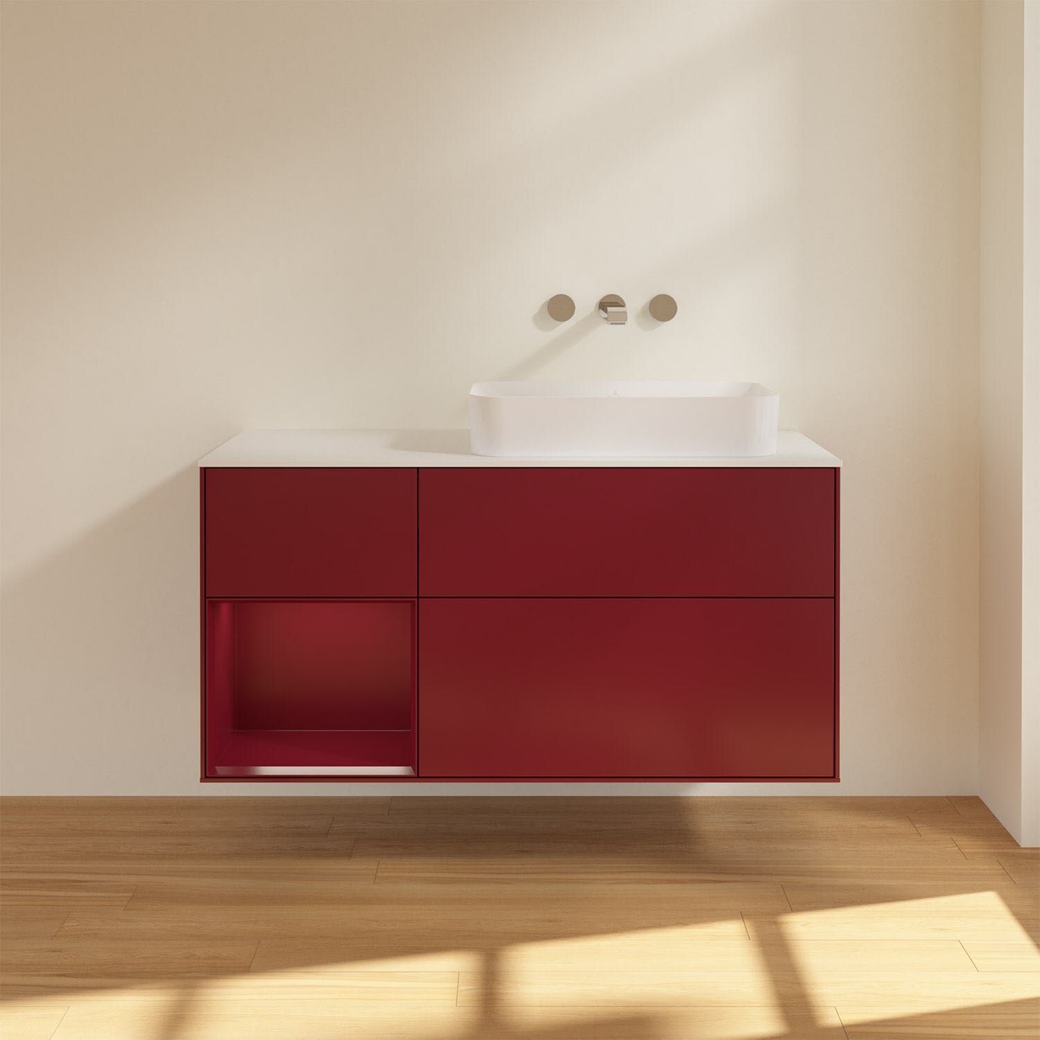 Ausdrucksstarkes Design und raffinierte Technik – der Finion Waschbeckenunterschrank von Villeroy & Boch punktet auf ganzer Linie. Dabei sorgt die stimmungsvolle, indirekte LED-Wandbeleuchtung sowie das beleuchtete Regalelement für ein behagliches Ambiente. Für allerlei Badutensilien gibt es genügend Stauraum in den drei großzügigen Auszügen mit rutschhemmenden Böden, verstellbaren Glasabtrennungen und Accessory Boxen. Die Auszüge lassen sich komfortabel durch leichten Druck öffnen und sie schließen dank Selbsteinzug langsam und leise. Noch mehr Ablagefläche für Seife, Zahnputzbecher und Co. bietet die Abdeckplatte. Für eine hochwertige Beschaffenheit und Optik des Möbels sorgt die mehrschichtig lackierte Oberfläche.