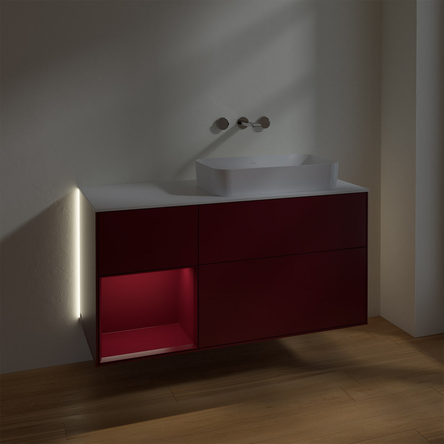 Villeroy & Boch Finion Waschtischunterschrank 120 cm mit Regalelement links und Abdeckplatte, mit Wandbeleuchtung