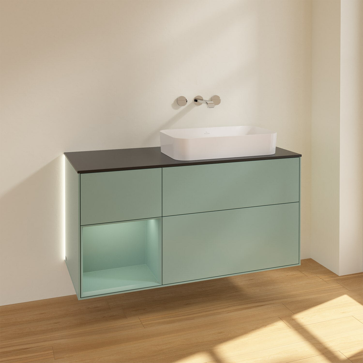 Villeroy & Boch Finion Waschtischunterschrank 120 cm mit Regalelement links und Abdeckplatte, mit Wandbeleuchtung