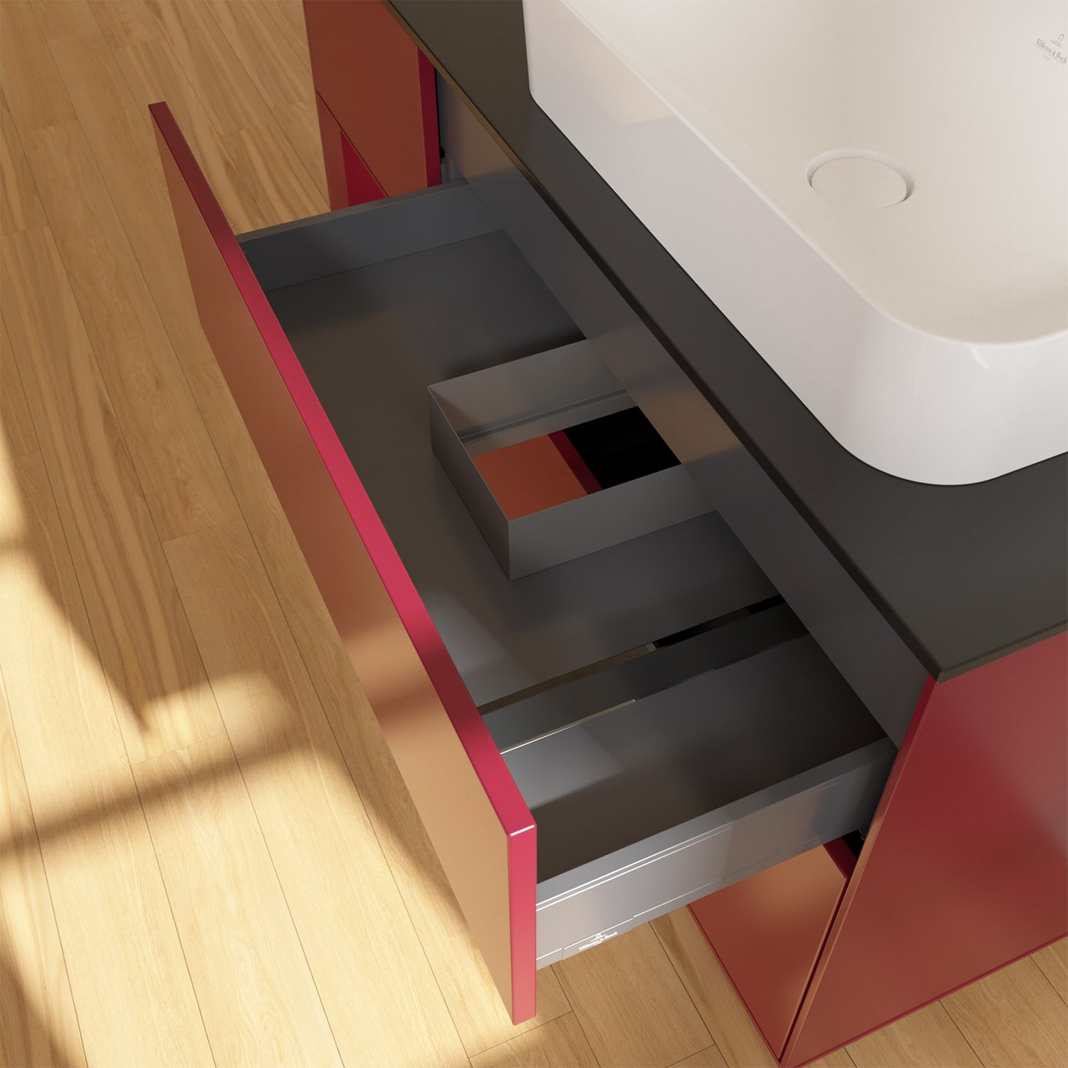 Ausdrucksstarkes Design und raffinierte Technik – der Finion Waschbeckenunterschrank von Villeroy & Boch punktet auf ganzer Linie. Dabei sorgt die stimmungsvolle, indirekte LED-Wandbeleuchtung sowie das beleuchtete Regalelement für ein behagliches Ambiente. Für allerlei Badutensilien gibt es genügend Stauraum in den drei großzügigen Auszügen mit rutschhemmenden Böden, verstellbaren Glasabtrennungen und Accessory Boxen. Die Auszüge lassen sich komfortabel durch leichten Druck öffnen und sie schließen dank Selbsteinzug langsam und leise. Noch mehr Ablagefläche für Seife, Zahnputzbecher und Co. bietet die Abdeckplatte. Für eine hochwertige Beschaffenheit und Optik des Möbels sorgt die mehrschichtig lackierte Oberfläche.