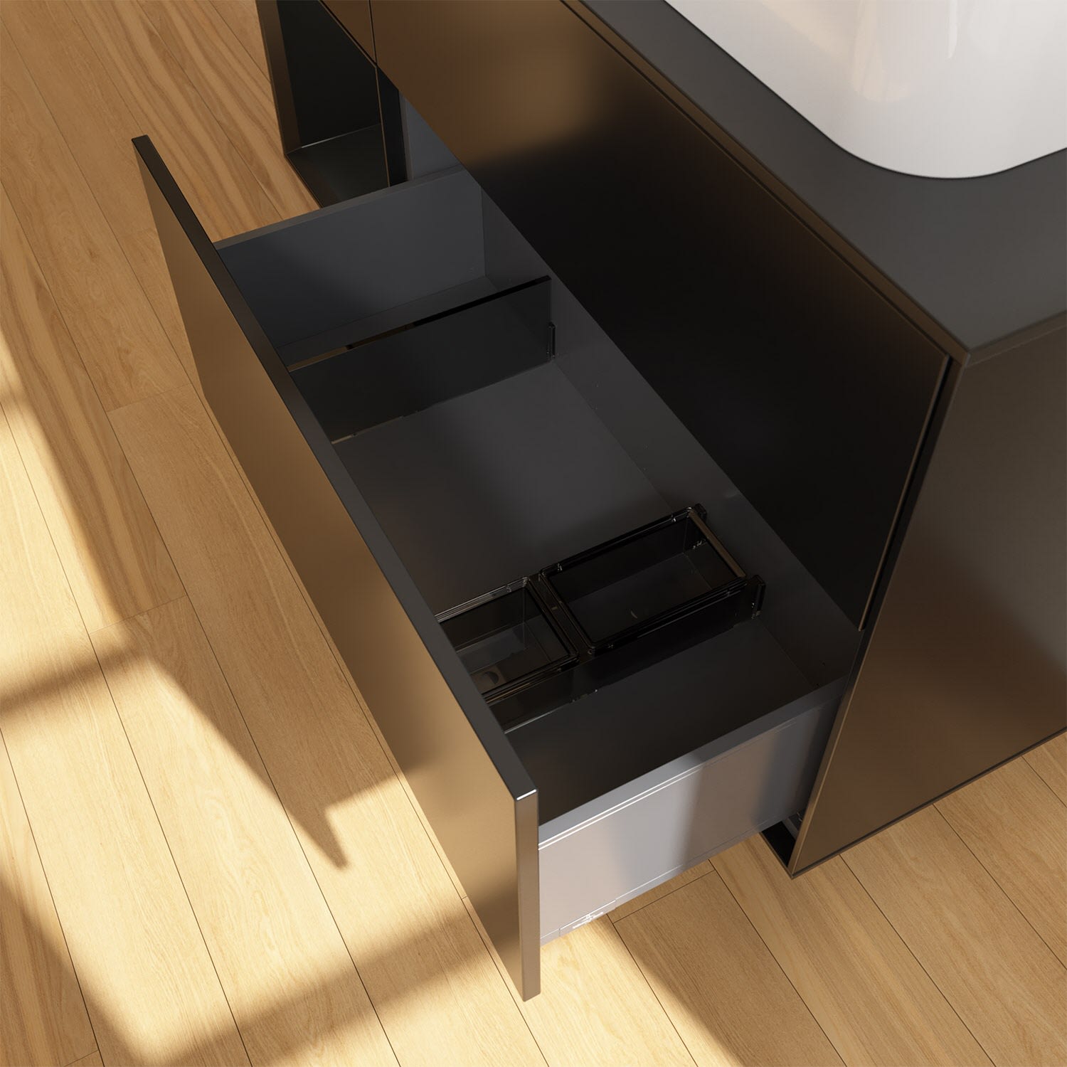Ausdrucksstarkes Design und raffinierte Technik – der Finion Waschbeckenunterschrank von Villeroy & Boch punktet auf ganzer Linie. Dabei sorgt die stimmungsvolle, indirekte LED-Wandbeleuchtung sowie das beleuchtete Regalelement für ein behagliches Ambiente. Für allerlei Badutensilien gibt es genügend Stauraum in den drei großzügigen Auszügen mit rutschhemmenden Böden, verstellbaren Glasabtrennungen und Accessory Boxen. Die Auszüge lassen sich komfortabel durch leichten Druck öffnen und sie schließen dank Selbsteinzug langsam und leise. Noch mehr Ablagefläche für Seife, Zahnputzbecher und Co. bietet die Abdeckplatte. Für eine hochwertige Beschaffenheit und Optik des Möbels sorgt die mehrschichtig lackierte Oberfläche.