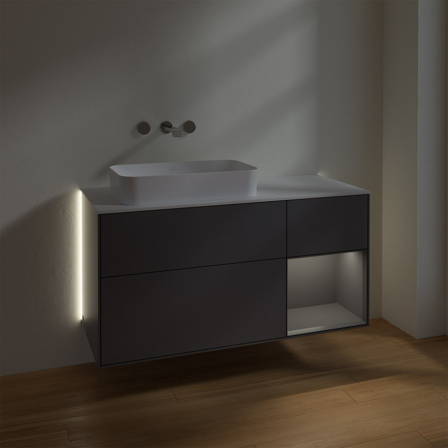 Villeroy & Boch Finion Waschtischunterschrank 120 cm mit Regalelement rechts und Abdeckplatte, mit Wandbeleuchtung