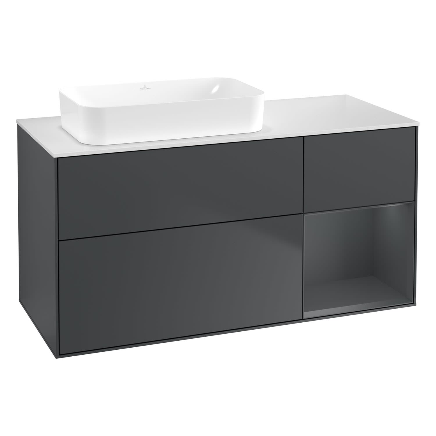 Villeroy & Boch Finion Waschtischunterschrank 120 cm mit Regalelement rechts und Abdeckplatte, mit Wandbeleuchtung