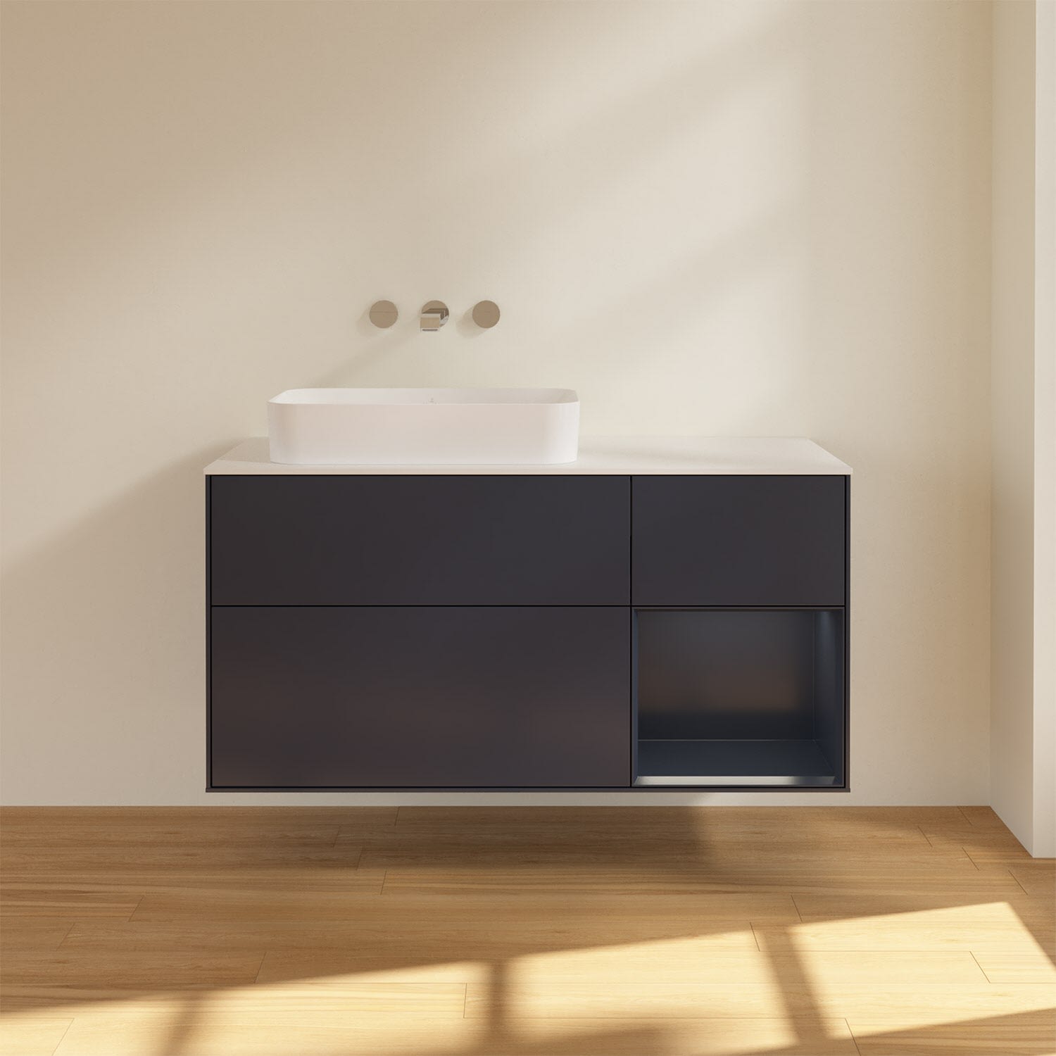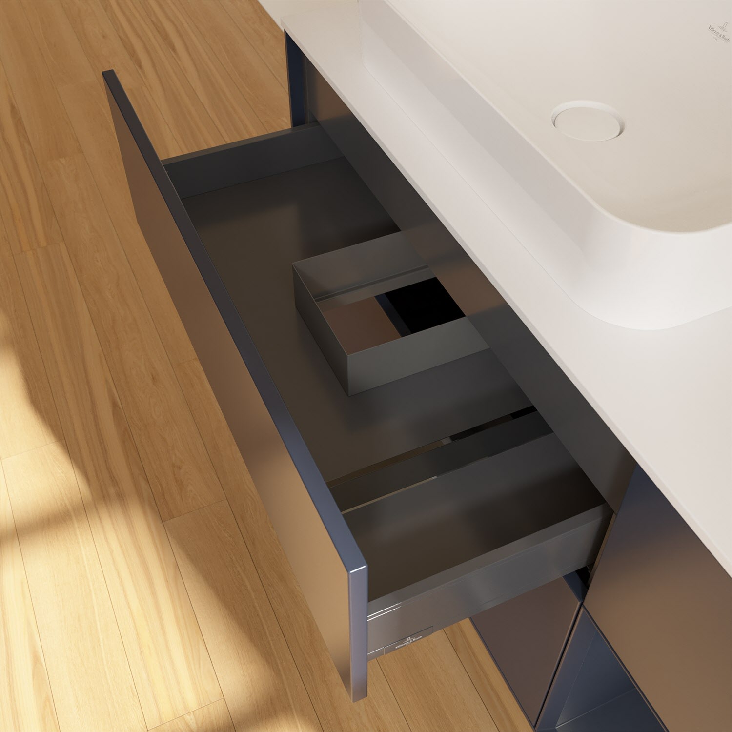 Ausdrucksstarkes Design und raffinierte Technik – der Finion Waschbeckenunterschrank von Villeroy & Boch punktet auf ganzer Linie. Dabei sorgt die stimmungsvolle, indirekte LED-Wandbeleuchtung sowie das beleuchtete Regalelement für ein behagliches Ambiente. Für allerlei Badutensilien gibt es genügend Stauraum in den drei großzügigen Auszügen mit rutschhemmenden Böden, verstellbaren Glasabtrennungen und Accessory Boxen. Die Auszüge lassen sich komfortabel durch leichten Druck öffnen und sie schließen dank Selbsteinzug langsam und leise. Noch mehr Ablagefläche für Seife, Zahnputzbecher und Co. bietet die Abdeckplatte. Für eine hochwertige Beschaffenheit und Optik des Möbels sorgt die mehrschichtig lackierte Oberfläche.