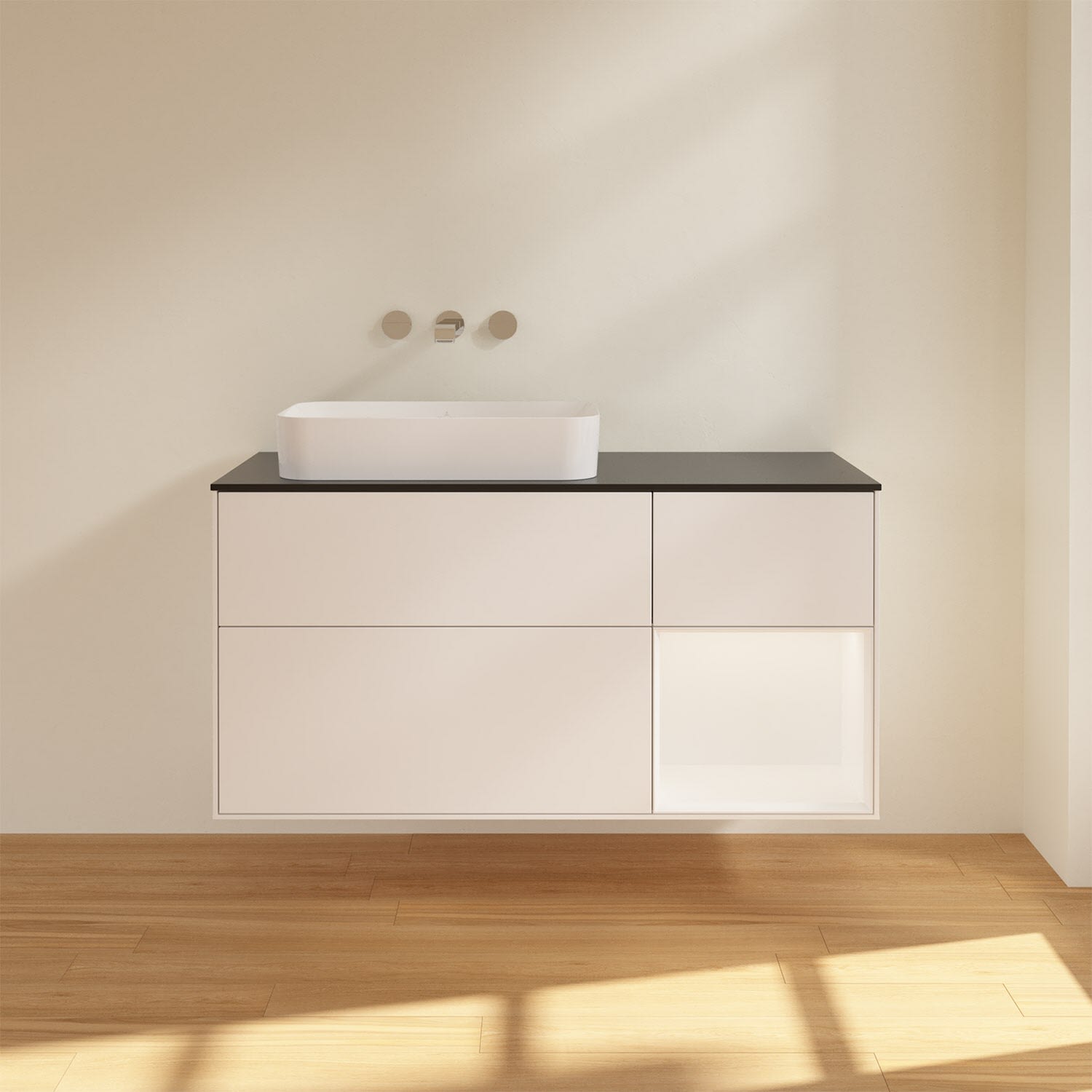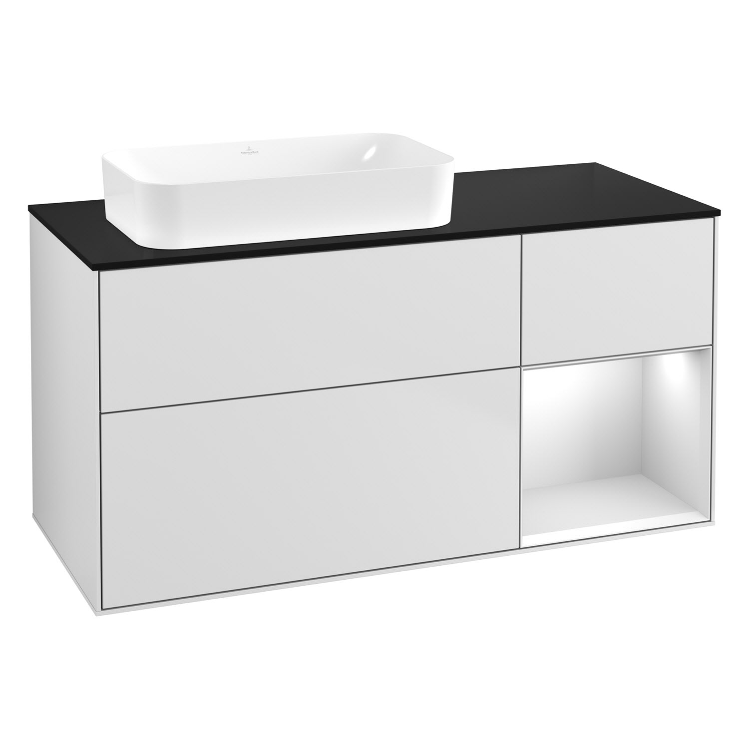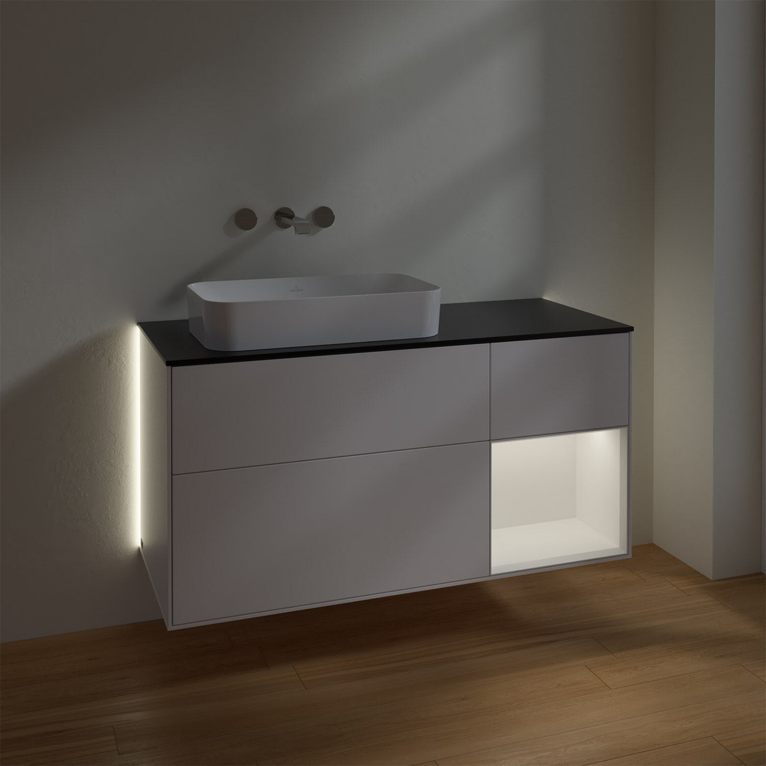Villeroy & Boch Finion Waschtischunterschrank 120 cm mit Regalelement rechts und Abdeckplatte, mit Wandbeleuchtung