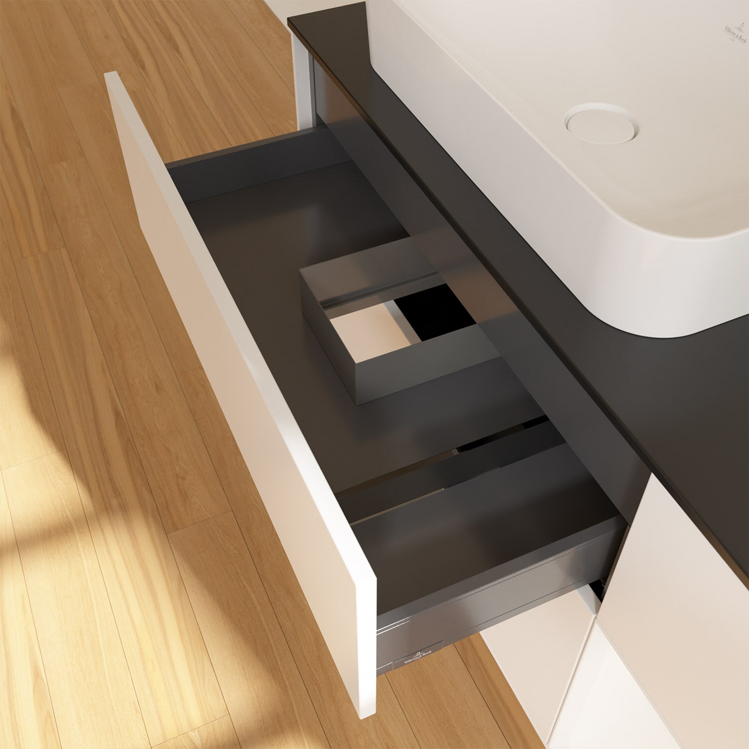 Ausdrucksstarkes Design und raffinierte Technik – der Finion Waschbeckenunterschrank von Villeroy & Boch punktet auf ganzer Linie. Dabei sorgt die stimmungsvolle, indirekte LED-Wandbeleuchtung sowie das beleuchtete Regalelement für ein behagliches Ambiente. Für allerlei Badutensilien gibt es genügend Stauraum in den drei großzügigen Auszügen mit rutschhemmenden Böden, verstellbaren Glasabtrennungen und Accessory Boxen. Die Auszüge lassen sich komfortabel durch leichten Druck öffnen und sie schließen dank Selbsteinzug langsam und leise. Noch mehr Ablagefläche für Seife, Zahnputzbecher und Co. bietet die Abdeckplatte. Für eine hochwertige Beschaffenheit und Optik des Möbels sorgt die mehrschichtig lackierte Oberfläche.