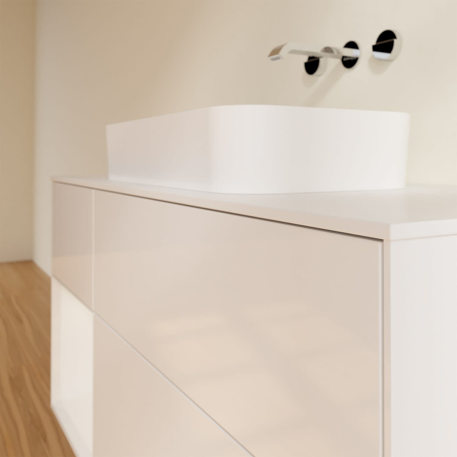 Ausdrucksstarkes Design und raffinierte Technik – der Finion Waschbeckenunterschrank von Villeroy & Boch punktet auf ganzer Linie. Dabei sorgt die stimmungsvolle, indirekte LED-Wandbeleuchtung sowie das beleuchtete Regalelement für ein behagliches Ambiente. Für allerlei Badutensilien gibt es genügend Stauraum in den drei großzügigen Auszügen mit rutschhemmenden Böden, verstellbaren Glasabtrennungen und Accessory Boxen. Die Auszüge lassen sich komfortabel durch leichten Druck öffnen und sie schließen dank Selbsteinzug langsam und leise. Noch mehr Ablagefläche für Seife, Zahnputzbecher und Co. bietet die Abdeckplatte. Für eine hochwertige Beschaffenheit und Optik des Möbels sorgt die mehrschichtig lackierte Oberfläche.