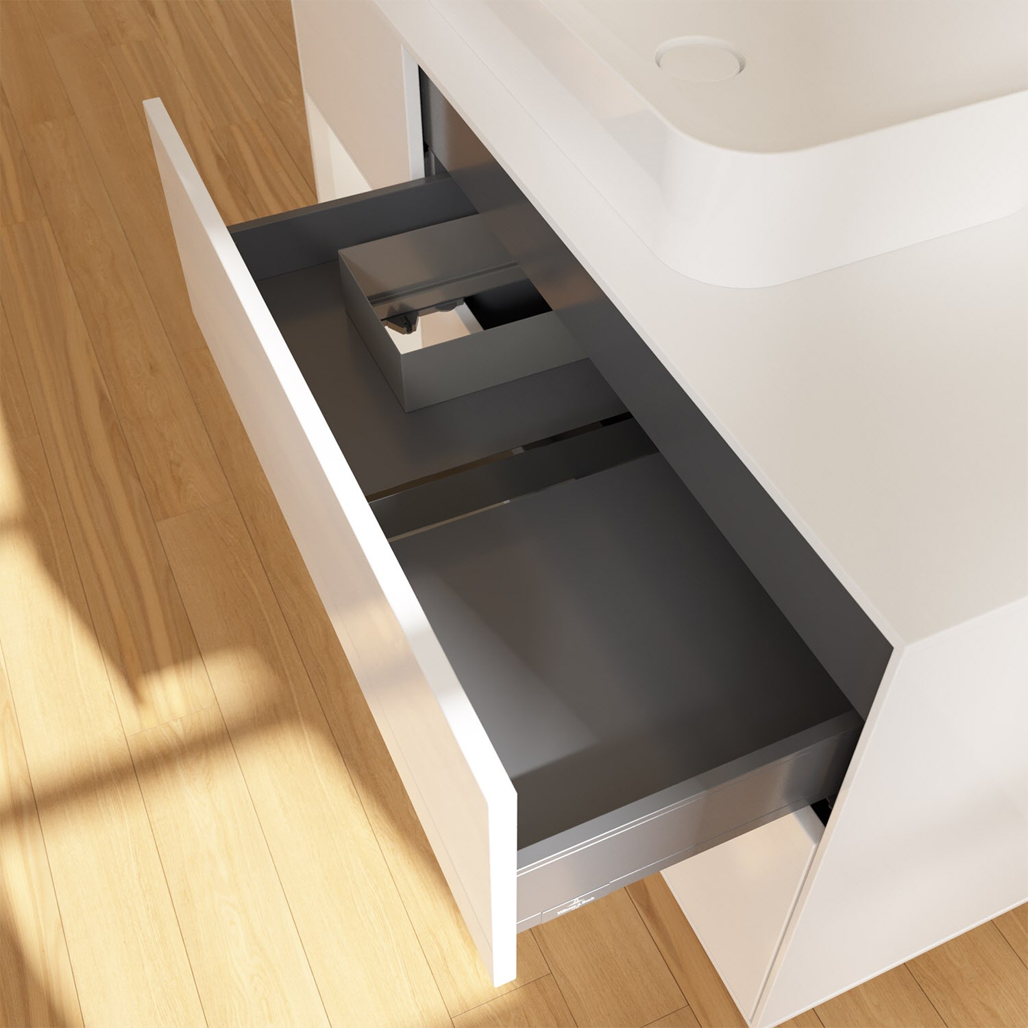 - kein Umfallen oder Verrutschen von Pflegeprodukten in den Schubladen dank rutschhemmendem Boden