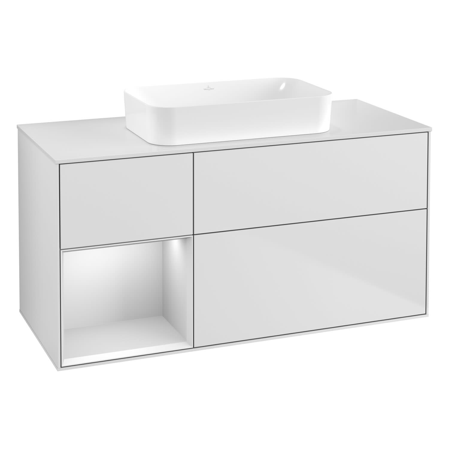 Villeroy & Boch Finion Waschtischunterschrank 120 cm mit Regalelement links und Abdeckplatte, mit Wandbeleuchtung