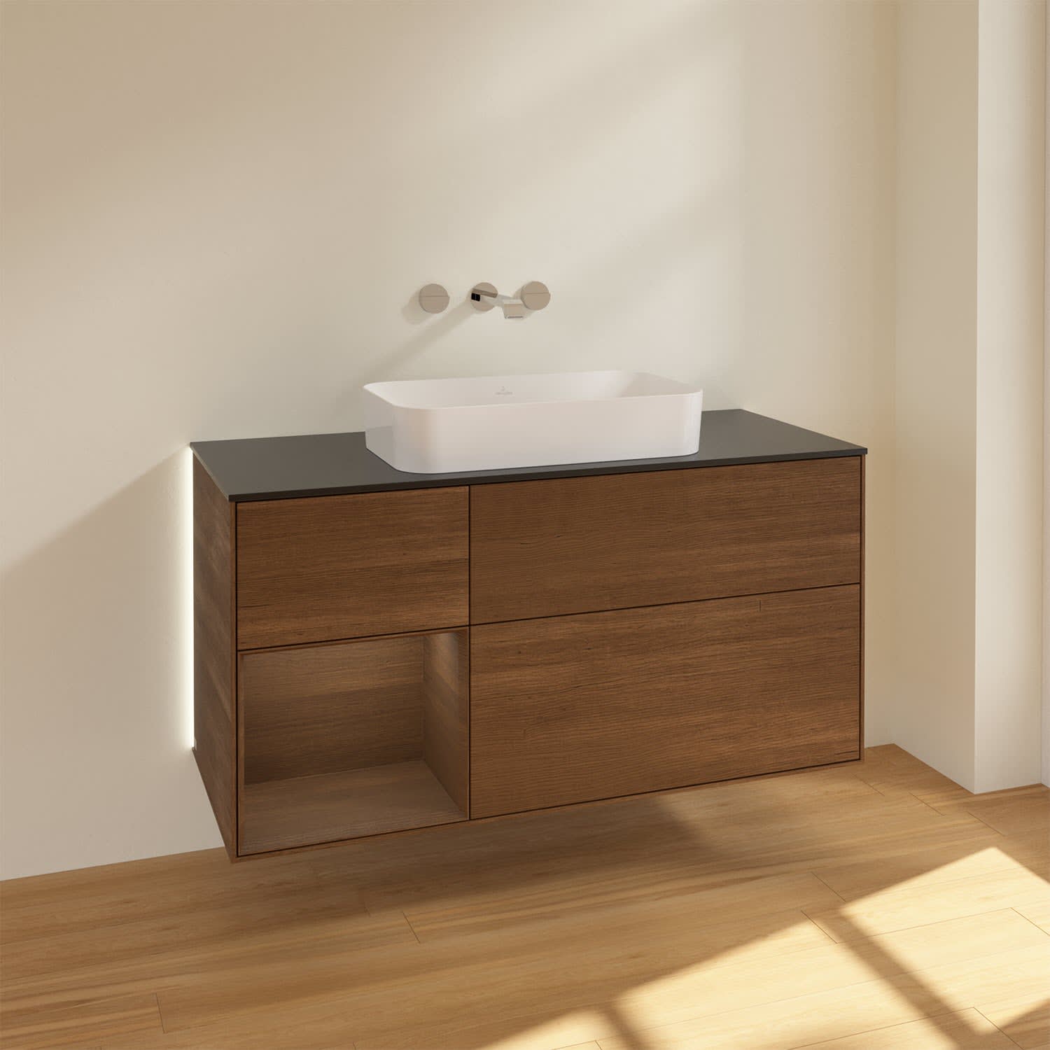 Villeroy & Boch Finion Waschtischunterschrank 120 cm mit Regalelement links und Abdeckplatte, mit Wandbeleuchtung
