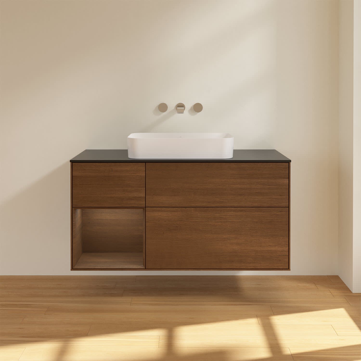 Ausdrucksstarkes Design und raffinierte Technik – der Finion Waschbeckenunterschrank von Villeroy & Boch punktet auf ganzer Linie. Dabei sorgt die stimmungsvolle, indirekte LED-Wandbeleuchtung sowie das beleuchtete Regalelement für ein behagliches Ambiente. Für allerlei Badutensilien gibt es genügend Stauraum in den drei großzügigen Auszügen mit rutschhemmenden Böden, verstellbaren Glasabtrennungen und Accessory Boxen. Die Auszüge lassen sich komfortabel durch leichten Druck öffnen und sie schließen dank Selbsteinzug langsam und leise. Noch mehr Ablagefläche für Seife, Zahnputzbecher und Co. bietet die Abdeckplatte. Für eine hochwertige Beschaffenheit und Optik des Möbels sorgt die mehrschichtig lackierte Oberfläche.