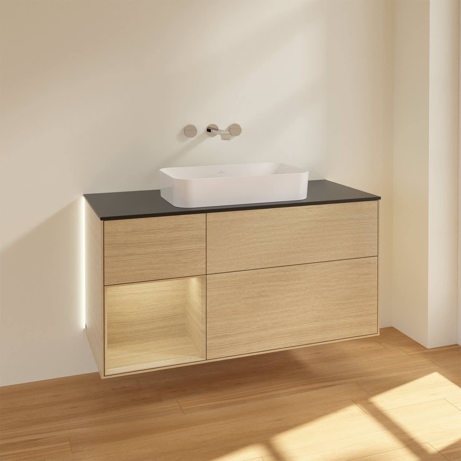 Villeroy & Boch Finion Waschtischunterschrank 120 cm mit Regalelement links und Abdeckplatte, mit Wandbeleuchtung
