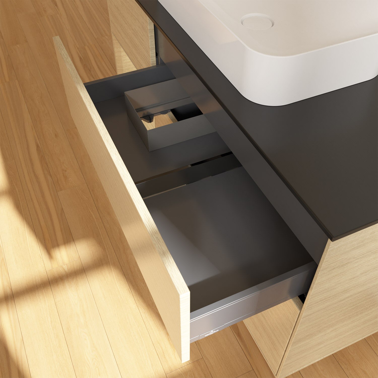 - kein Umfallen oder Verrutschen von Pflegeprodukten in den Schubladen dank rutschhemmendem Boden