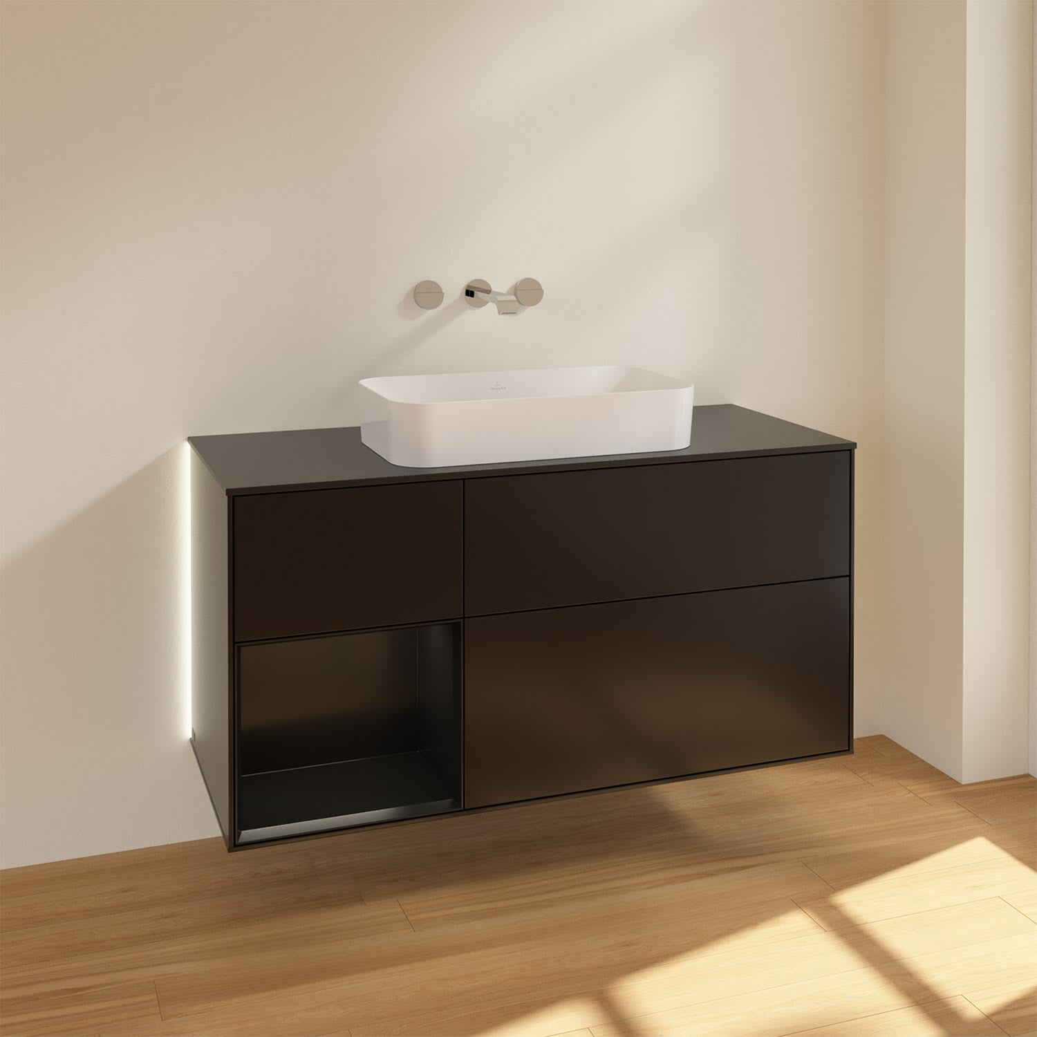 Villeroy & Boch Finion Waschtischunterschrank 120 cm mit Regalelement links und Abdeckplatte, mit Wandbeleuchtung
