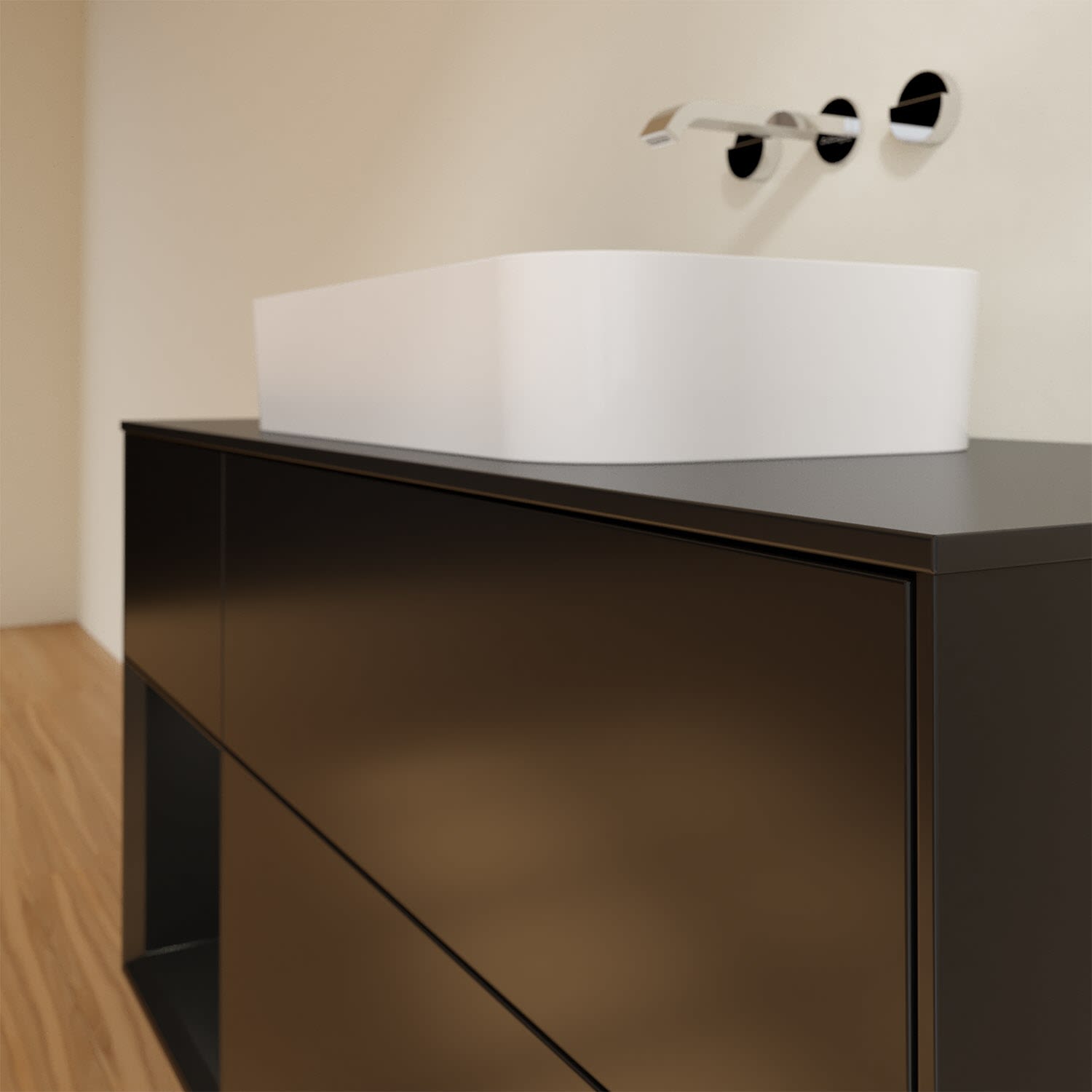 Ausdrucksstarkes Design und raffinierte Technik – der Finion Waschbeckenunterschrank von Villeroy & Boch punktet auf ganzer Linie. Dabei sorgt die stimmungsvolle, indirekte LED-Wandbeleuchtung sowie das beleuchtete Regalelement für ein behagliches Ambiente. Für allerlei Badutensilien gibt es genügend Stauraum in den drei großzügigen Auszügen mit rutschhemmenden Böden, verstellbaren Glasabtrennungen und Accessory Boxen. Die Auszüge lassen sich komfortabel durch leichten Druck öffnen und sie schließen dank Selbsteinzug langsam und leise. Noch mehr Ablagefläche für Seife, Zahnputzbecher und Co. bietet die Abdeckplatte. Für eine hochwertige Beschaffenheit und Optik des Möbels sorgt die mehrschichtig lackierte Oberfläche.