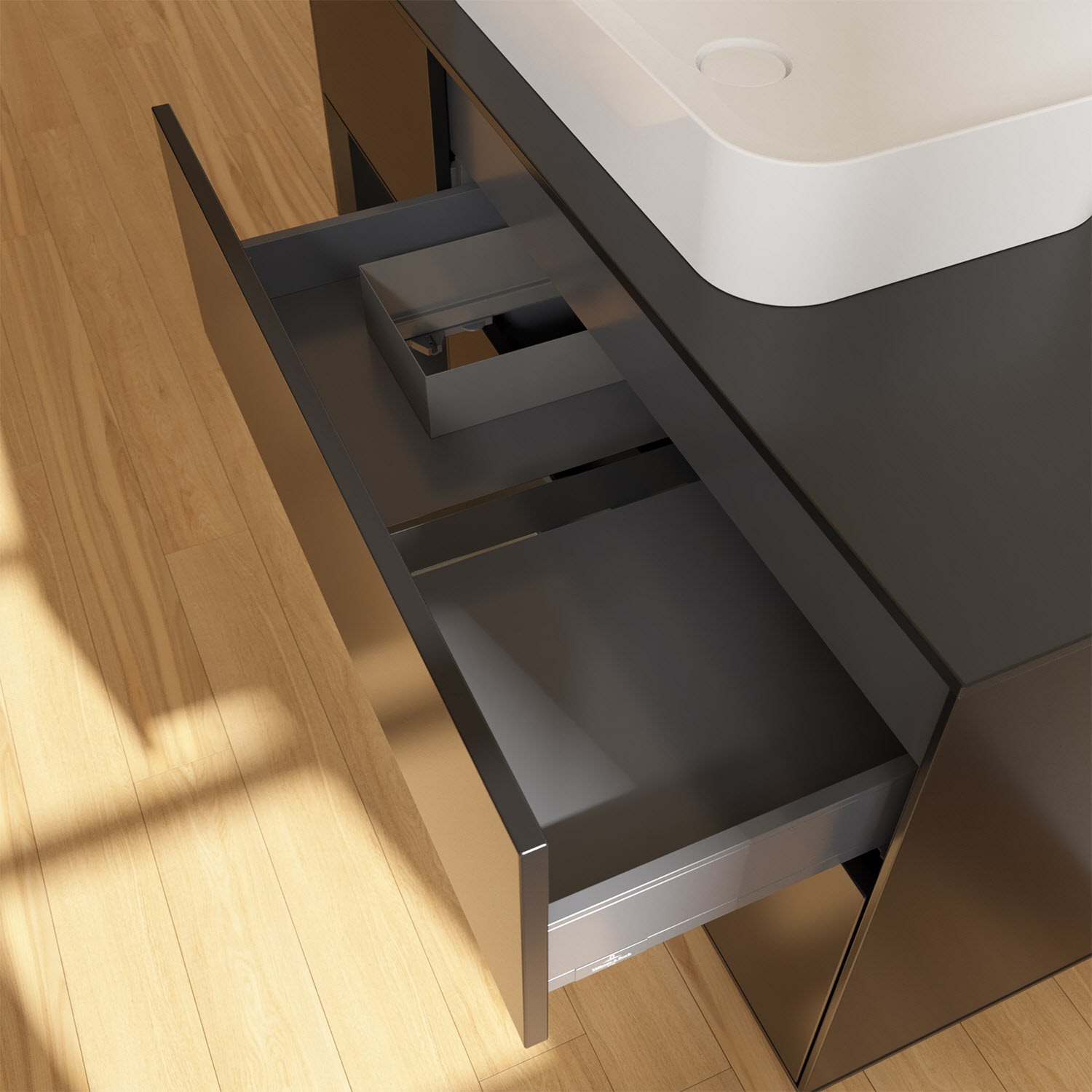- kein Umfallen oder Verrutschen von Pflegeprodukten in den Schubladen dank rutschhemmendem Boden