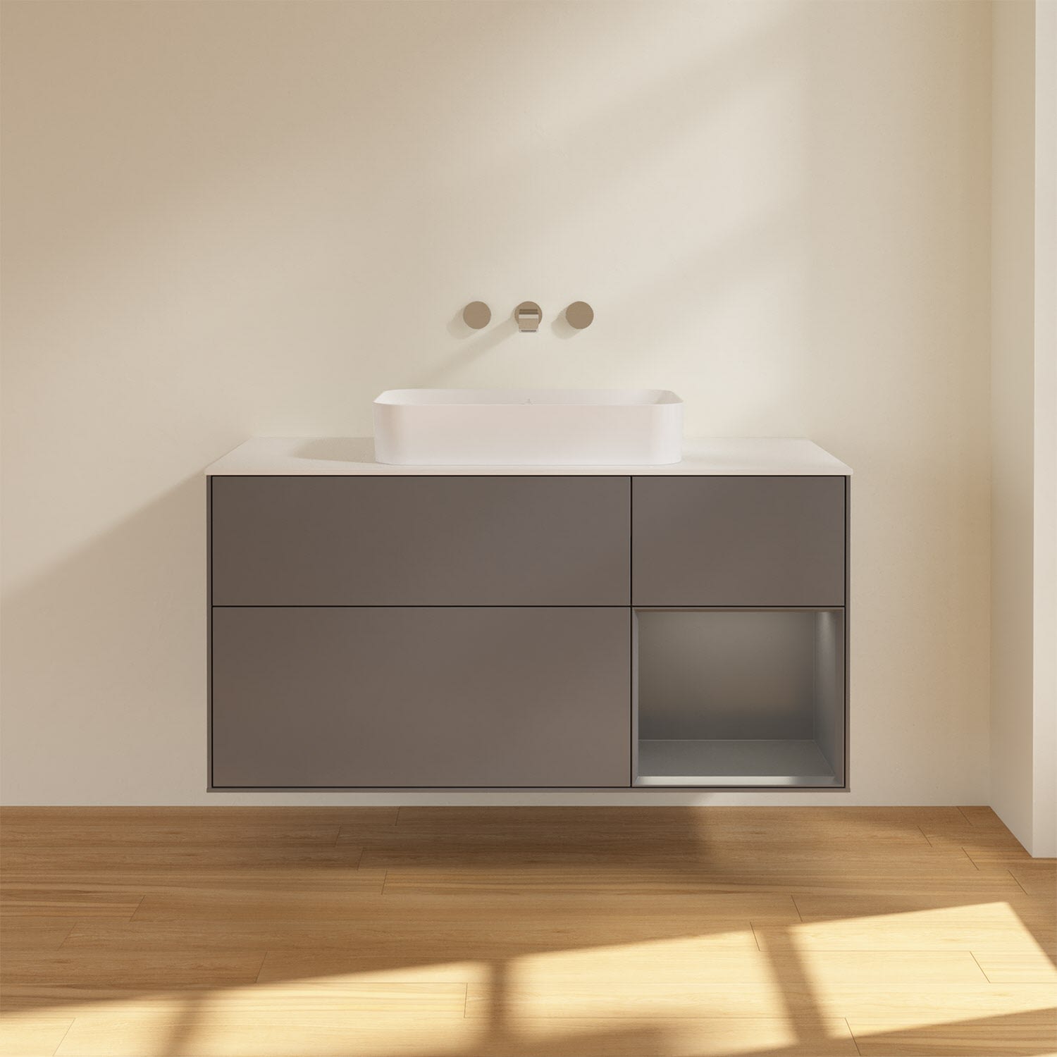 Ausdrucksstarkes Design und raffinierte Technik – der Finion Waschbeckenunterschrank von Villeroy & Boch punktet auf ganzer Linie. Dabei sorgt die stimmungsvolle, indirekte LED-Wandbeleuchtung sowie das beleuchtete Regalelement für ein behagliches Ambiente. Für allerlei Badutensilien gibt es genügend Stauraum in den drei großzügigen Auszügen mit rutschhemmenden Böden, verstellbaren Glasabtrennungen und Accessory Boxen. Die Auszüge lassen sich komfortabel durch leichten Druck öffnen und sie schließen dank Selbsteinzug langsam und leise. Noch mehr Ablagefläche für Seife, Zahnputzbecher und Co. bietet die Abdeckplatte. Für eine hochwertige Beschaffenheit und Optik des Möbels sorgt die mehrschichtig lackierte Oberfläche.