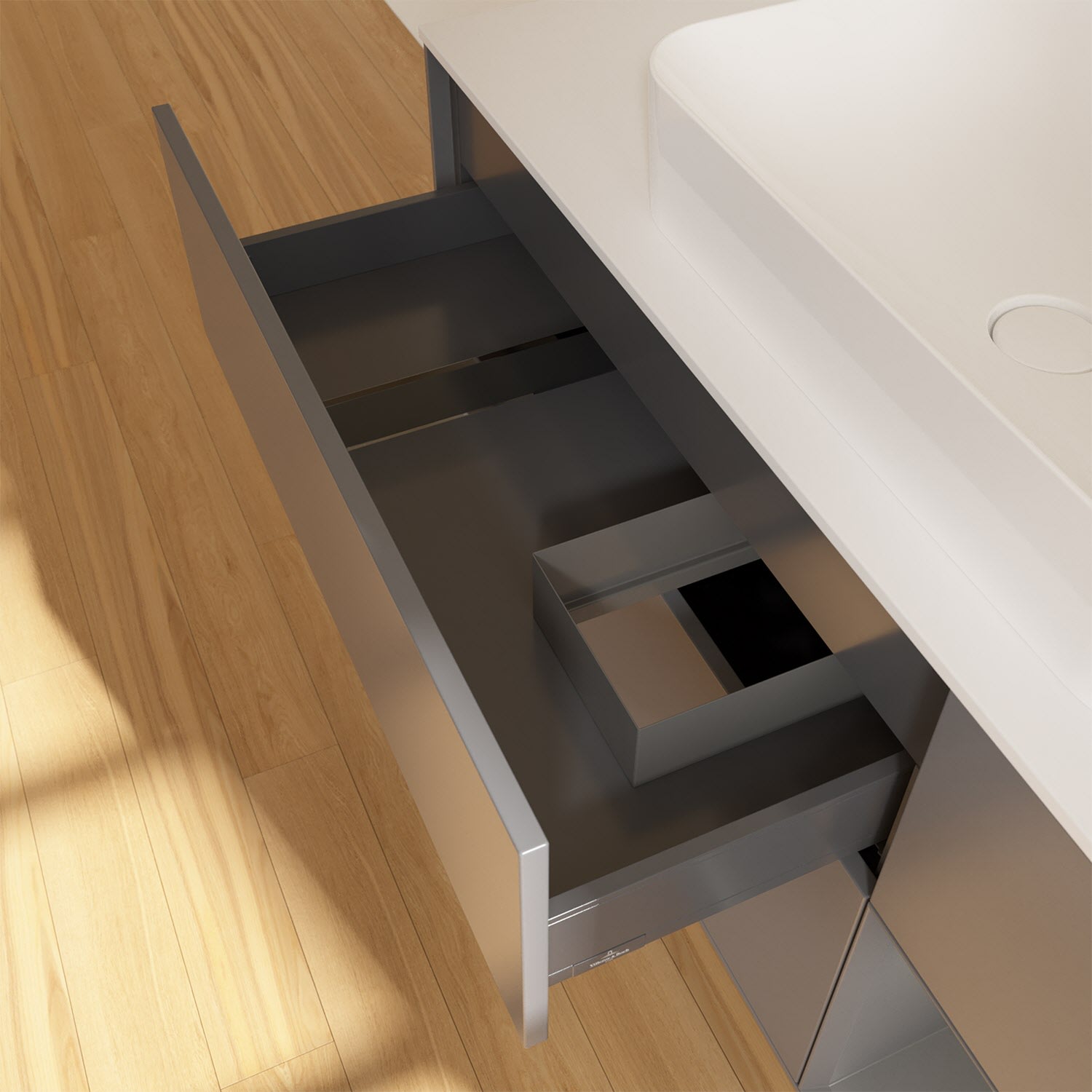 - kein Umfallen oder Verrutschen von Pflegeprodukten in den Schubladen dank rutschhemmendem Boden