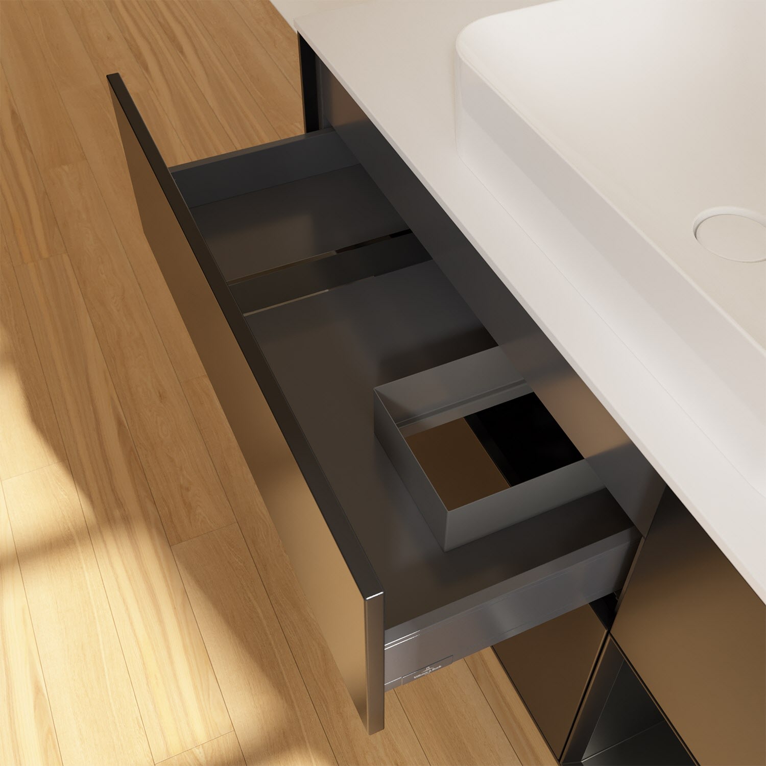 - kein Umfallen oder Verrutschen von Pflegeprodukten in den Schubladen dank rutschhemmendem Boden