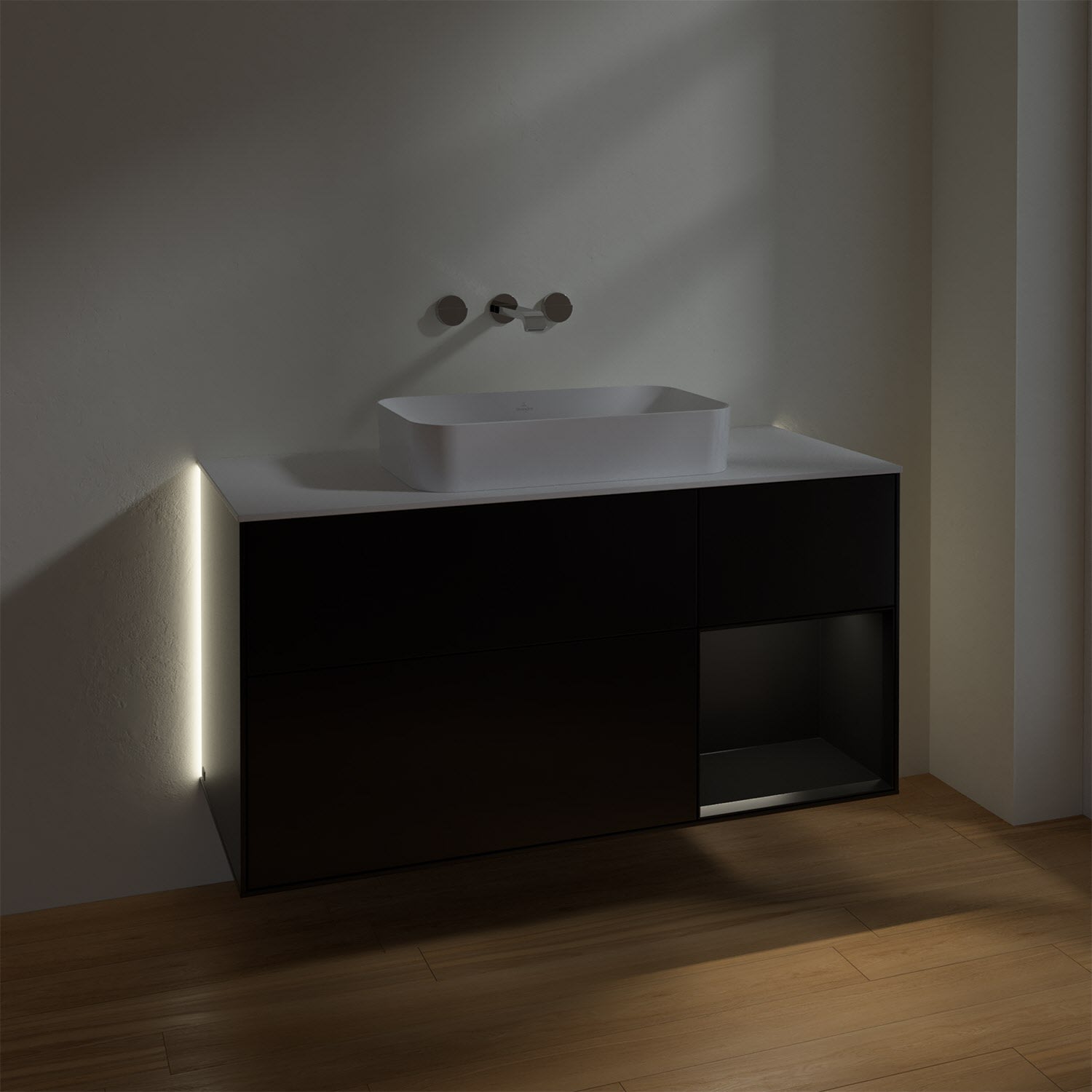 Villeroy & Boch Finion Waschtischunterschrank 120 cm mit Regalelement rechts und Abdeckplatte, mit Wandbeleuchtung