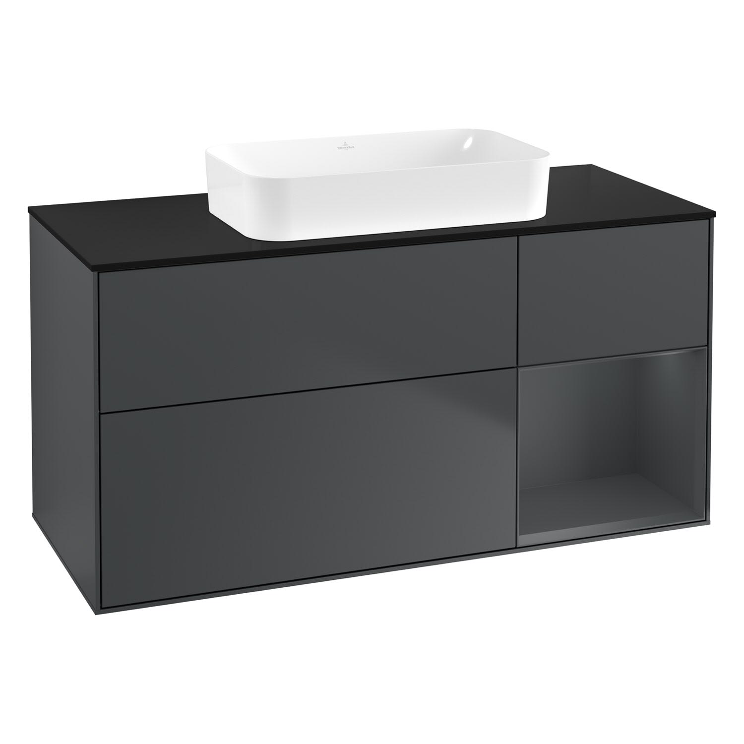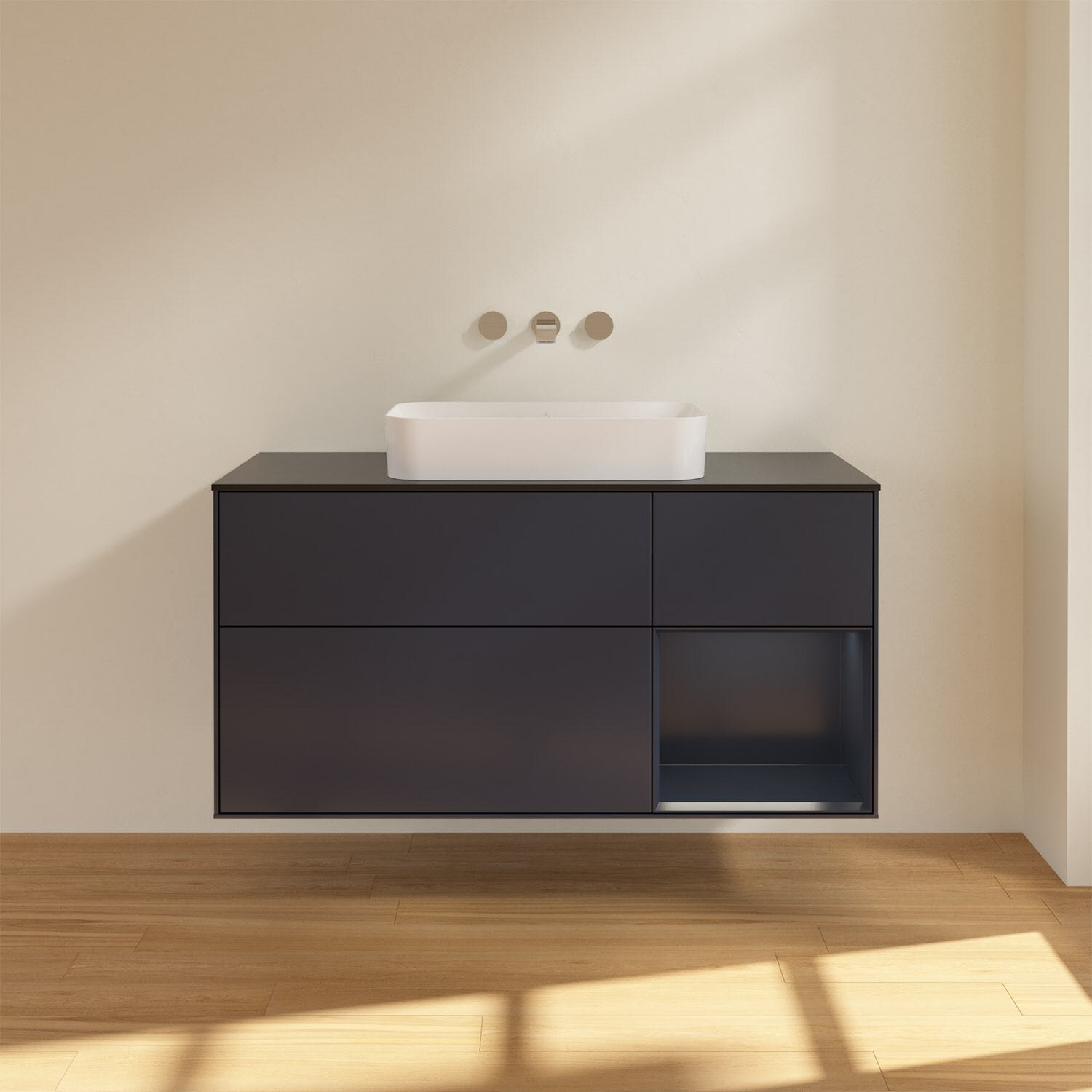 Villeroy & Boch Finion Waschtischunterschrank 120 cm mit Regalelement rechts und Abdeckplatte, mit Wandbeleuchtung