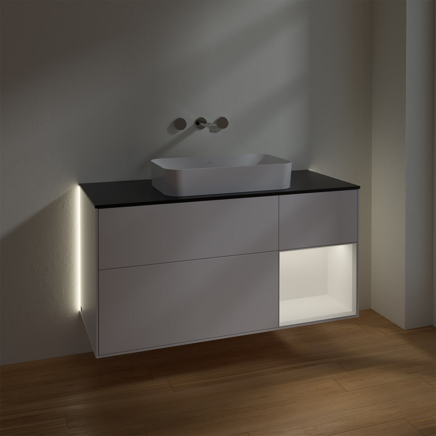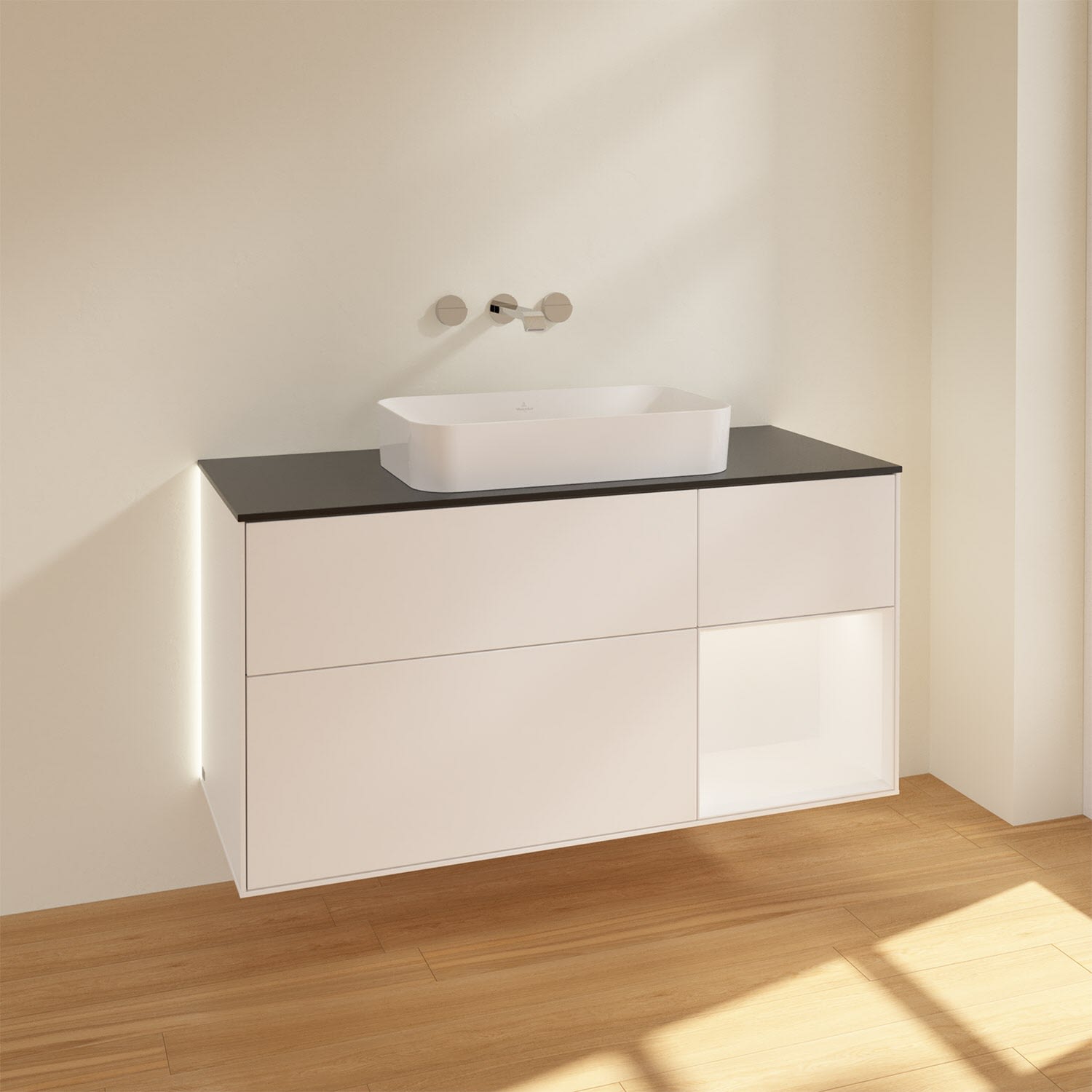 Villeroy & Boch Finion Waschtischunterschrank 120 cm mit Regalelement rechts und Abdeckplatte, mit Wandbeleuchtung